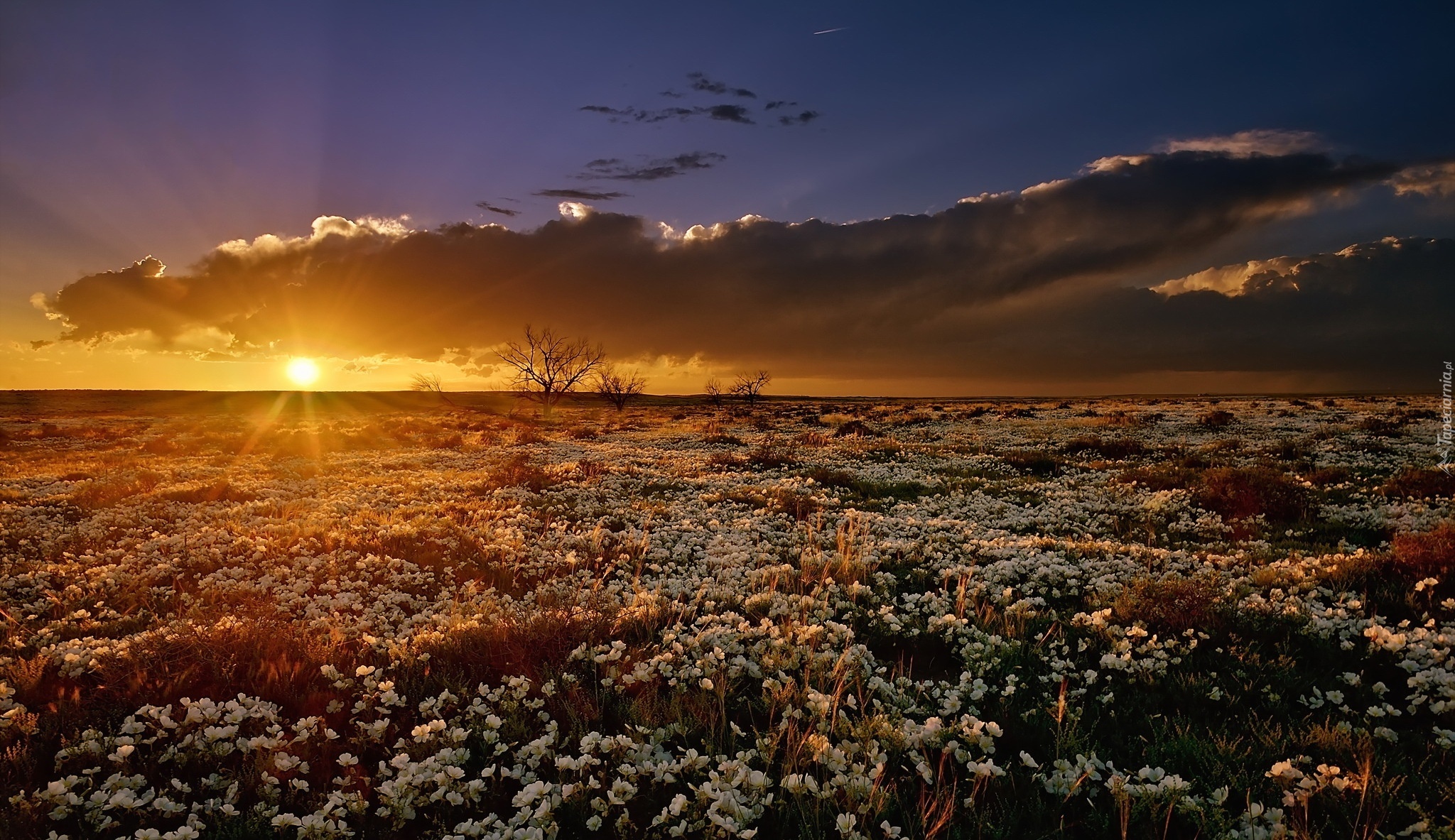 Edytor tapety: Zachód słońca, Promienie, Pole, Kwiaty