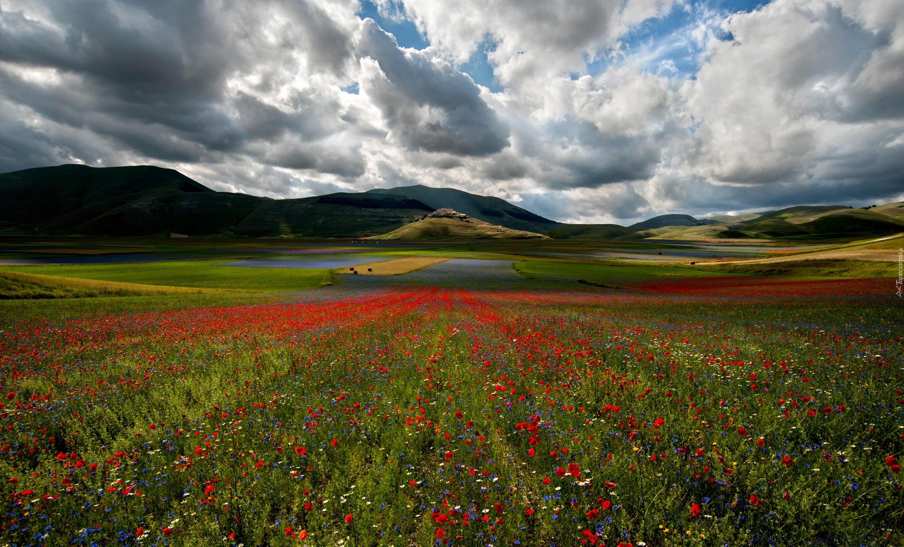 Edytor tapety: Chmury, Łąka, Kwiaty, Wzgórza