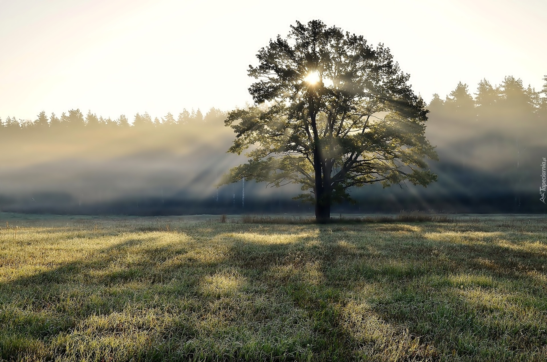Edytor tapety: Drzewo, Łąka, Mgła, Promienie, Słońca