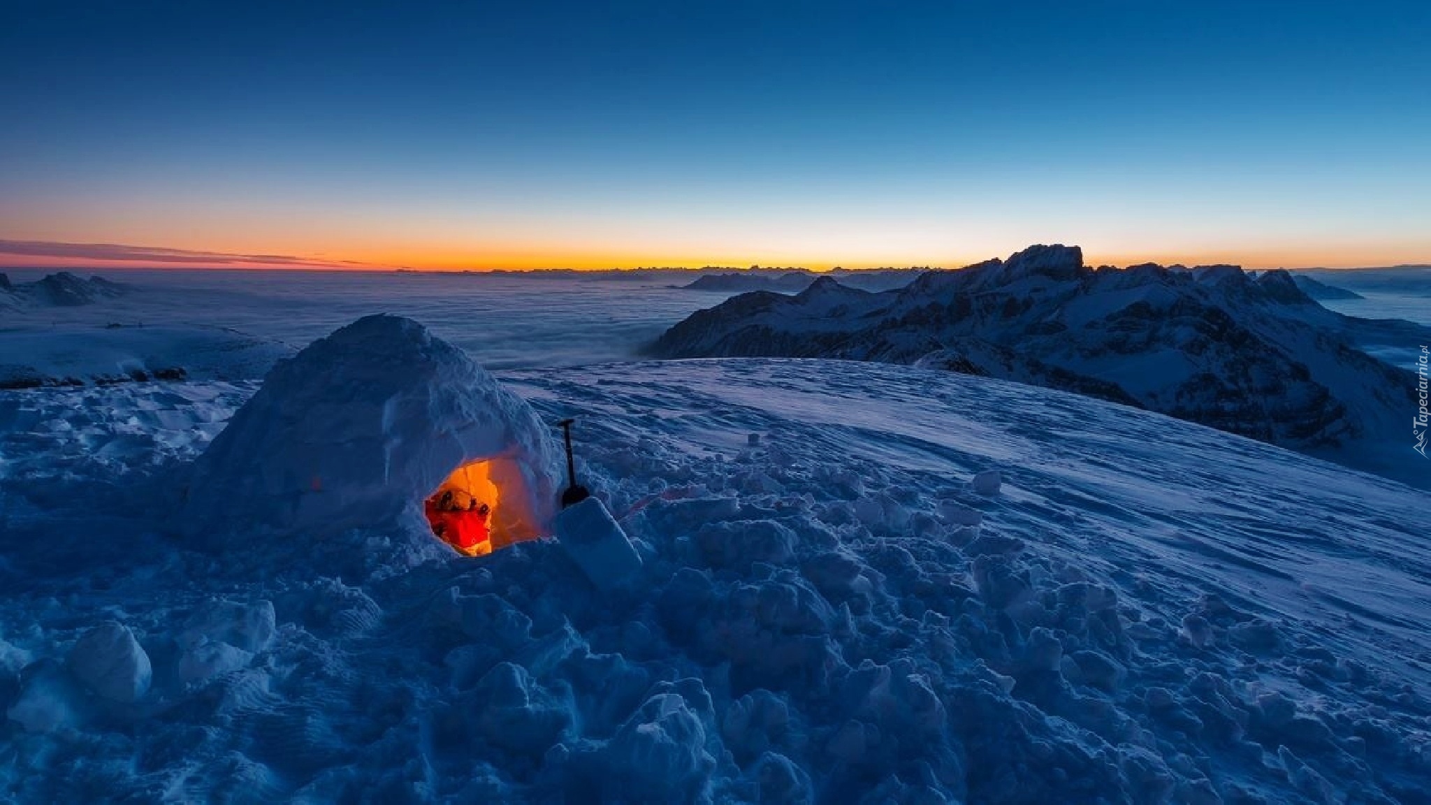 Edytor tapety: Zachód, Słońca, Igloo, Śnieg, Skały