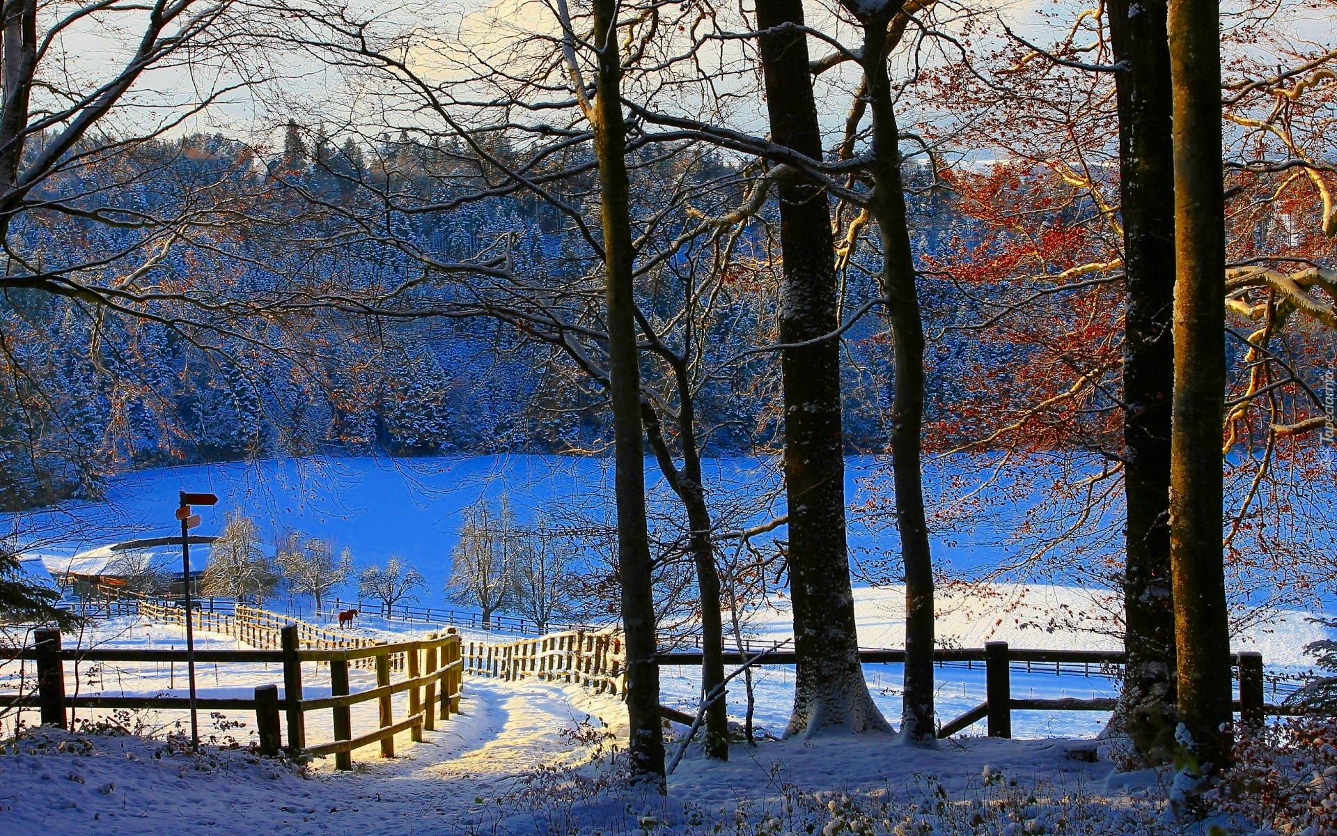 Edytor tapety: Jezioro, Las, Zima, Koń, Zagroda