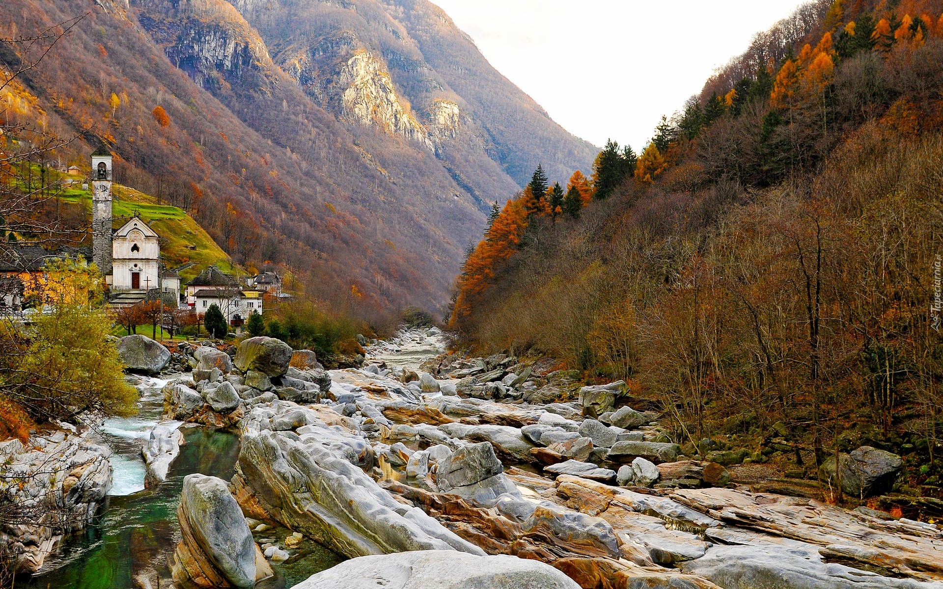 Edytor tapety: Góry, Jesień, Rzeka, Kamienie, Kościół