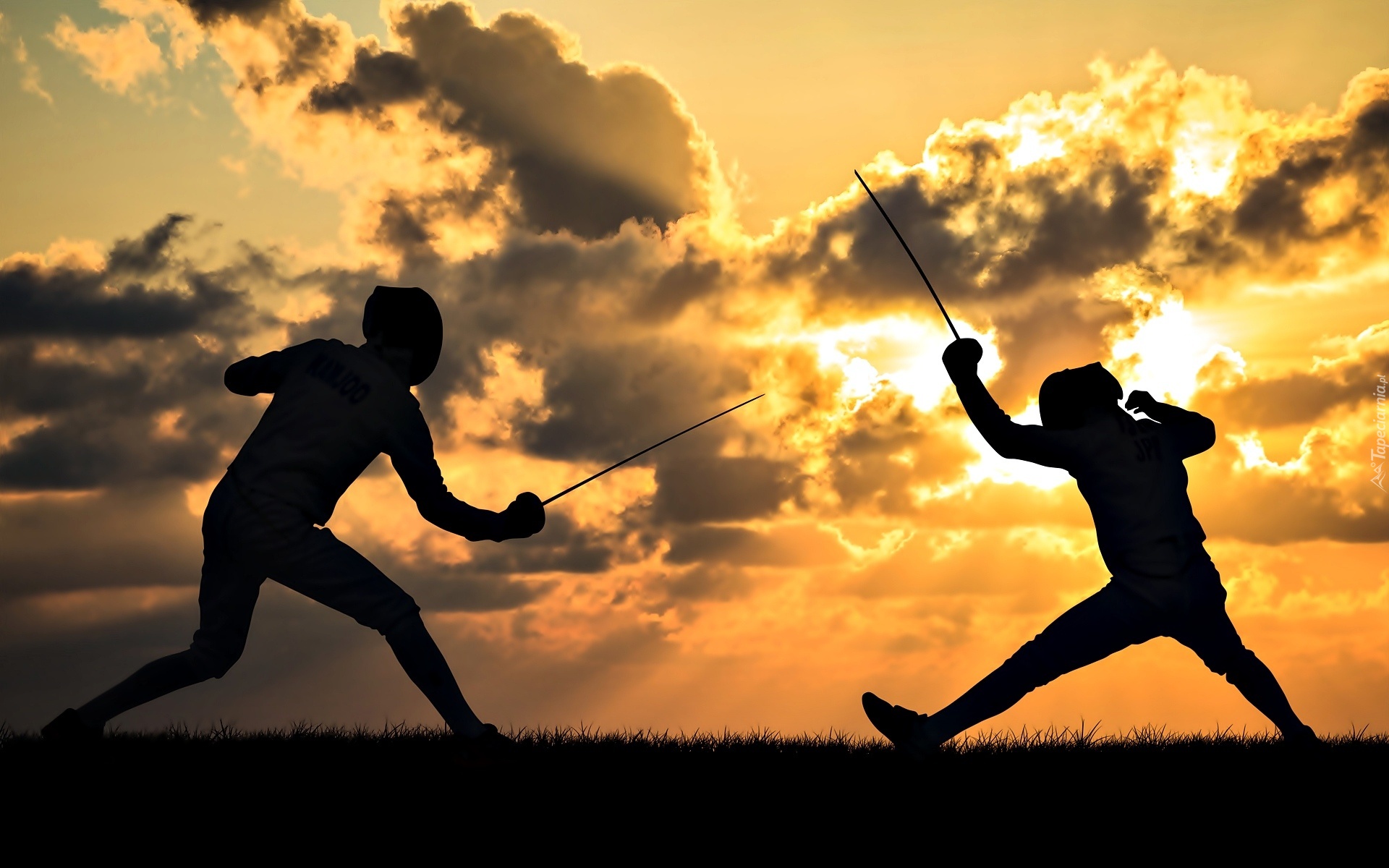 Edytor tapety: Zachód Słońca, Szermierka, Ludzie, Chmury