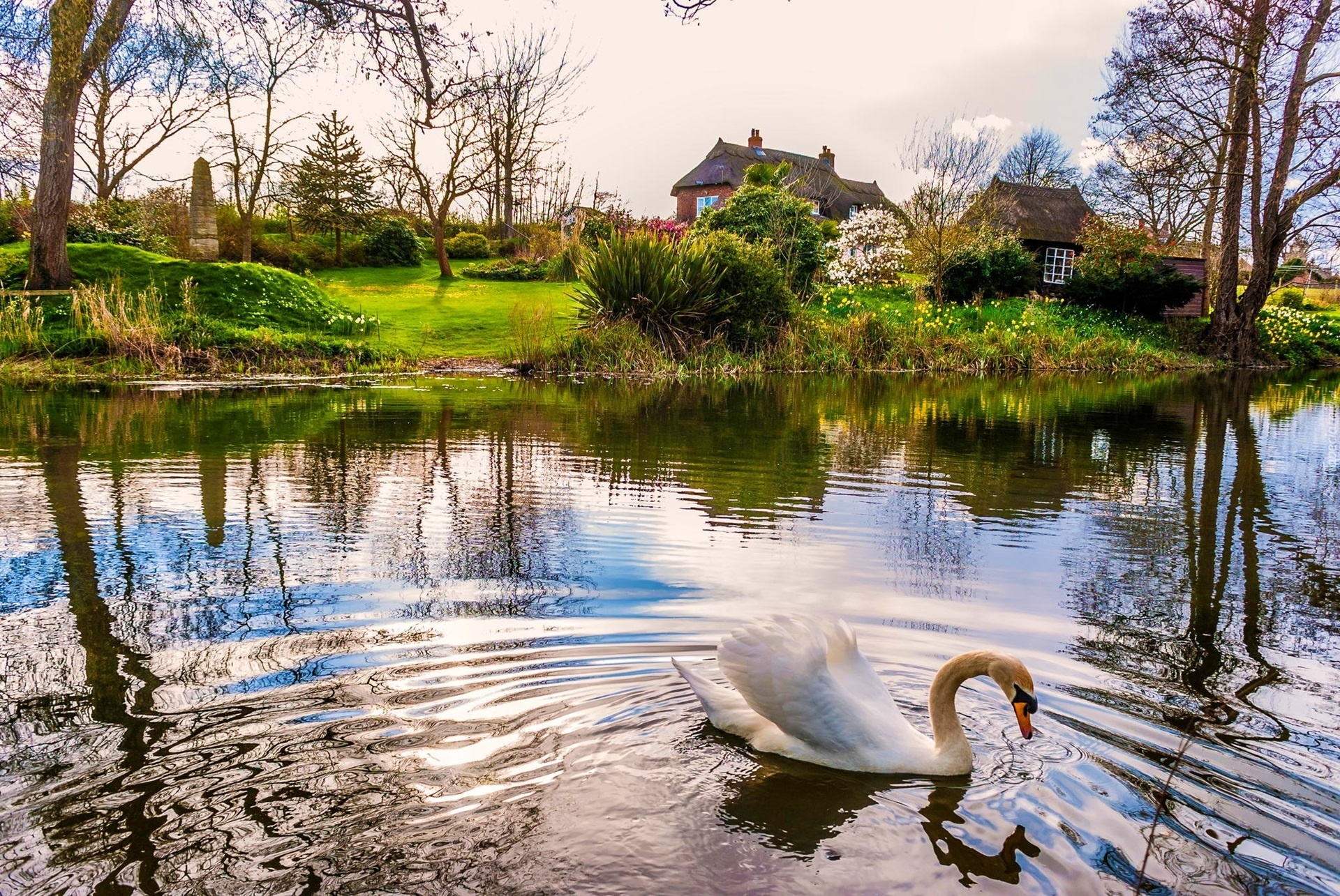 Edytor tapety: Staw, Łabędź, Domki, Wieś, Wiosna