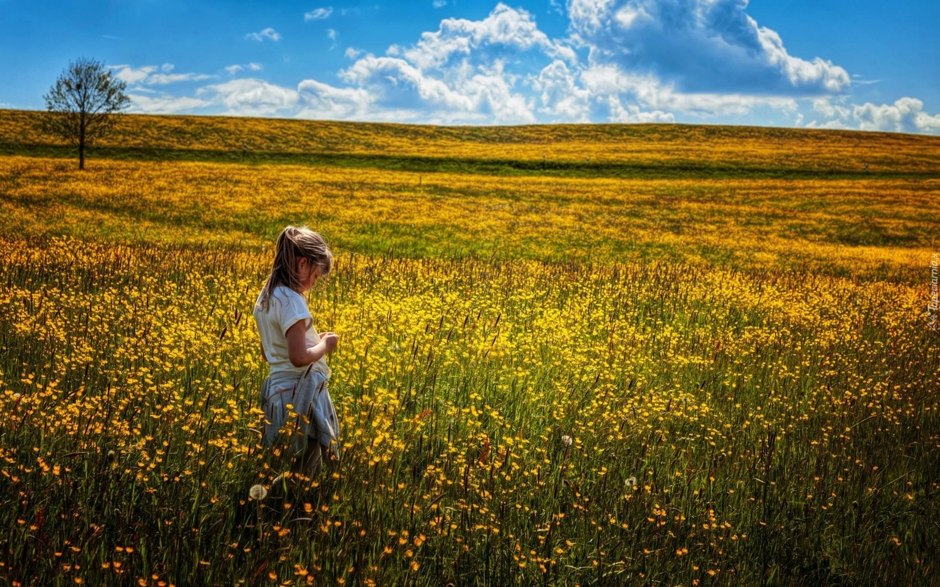 Edytor tapety: Dziewczynka, Łąka, Kwiaty, Niebo, Chmury