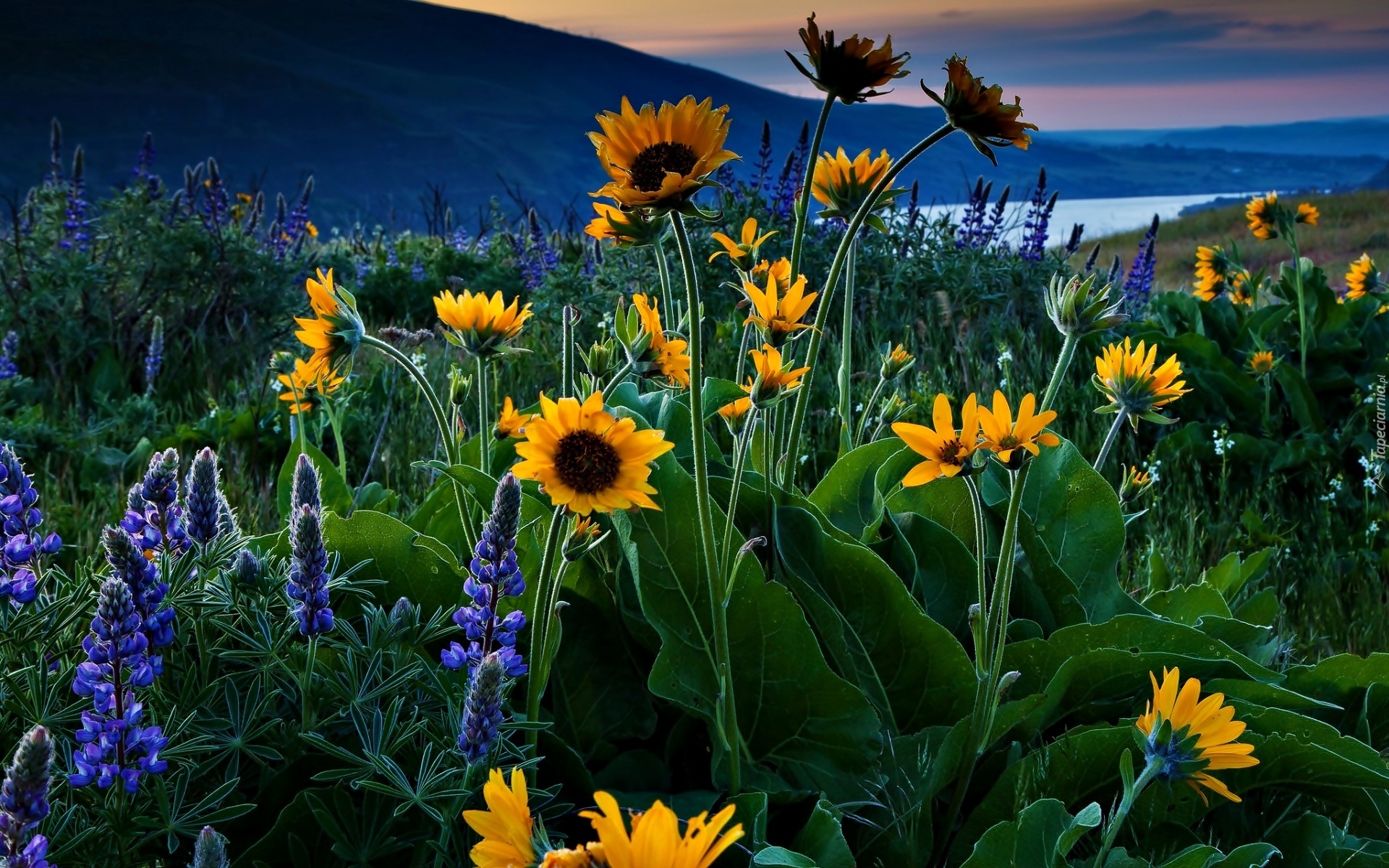 Edytor tapety: Góry, Kwiaty, Słoneczniki, Łubin