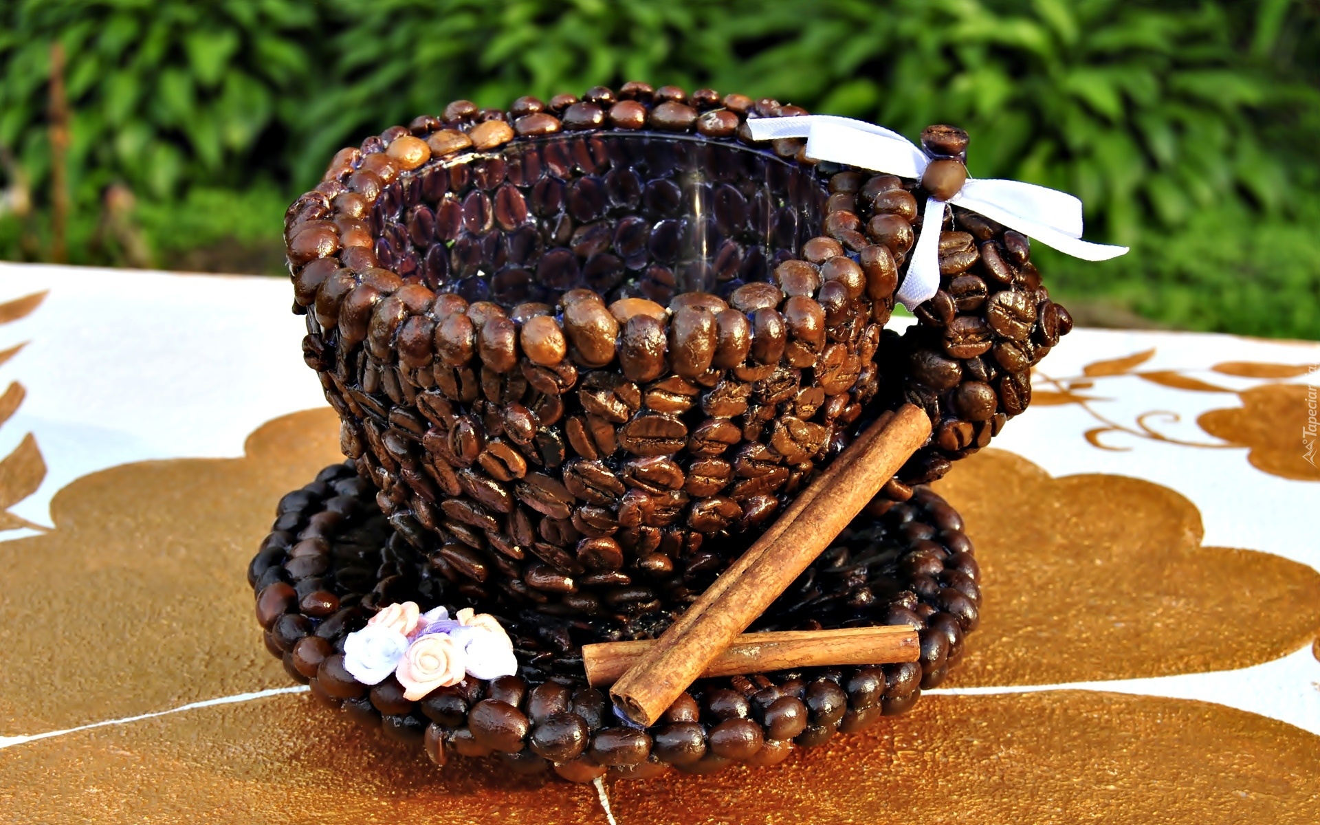 Edytor tapety: Ozdobna, Filiżanka, Talerzyk, Ziarna, Kawy, Cynamon