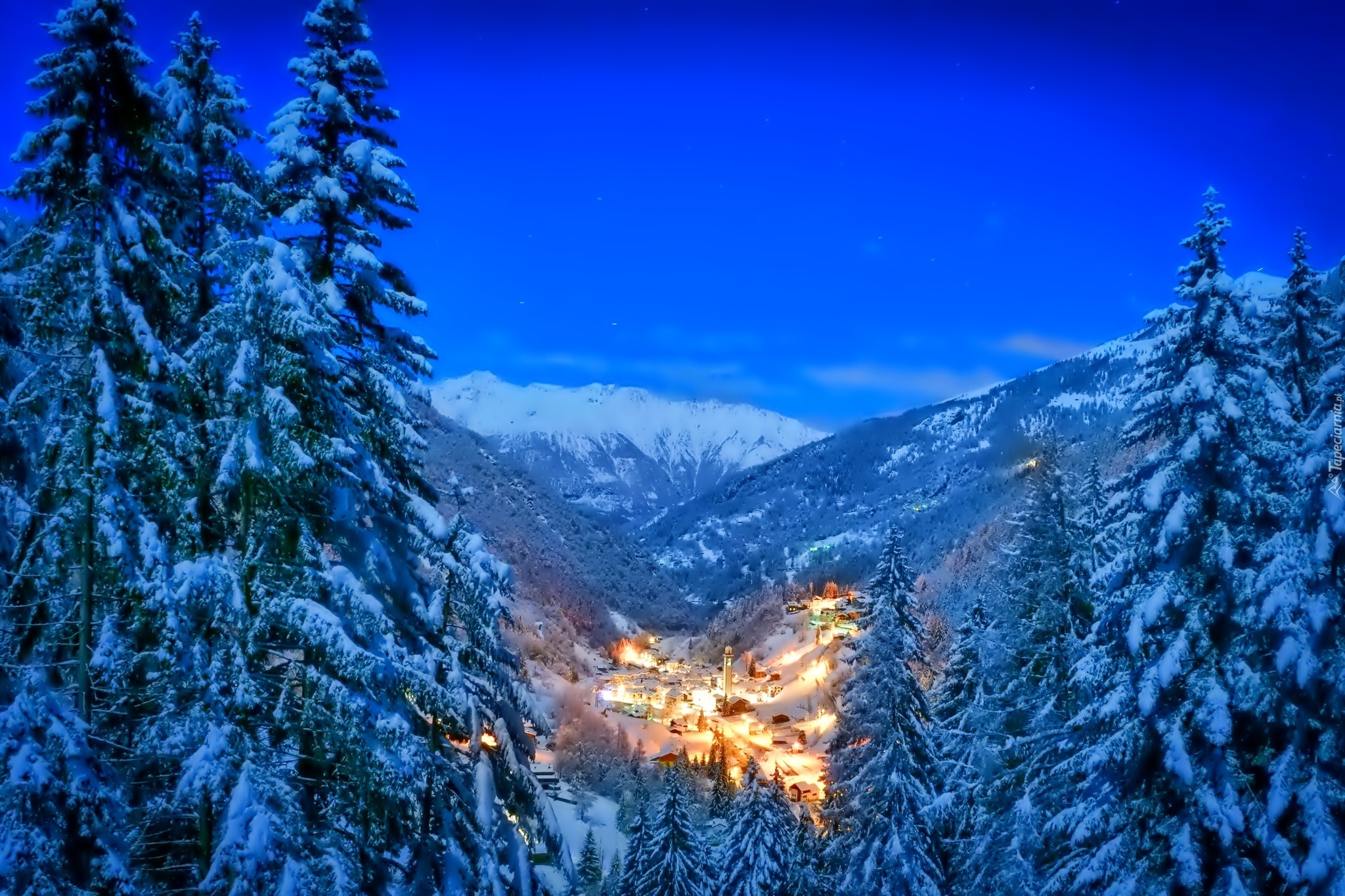 Edytor tapety: Wioska, Góry, Lasy, Dolina, Zima