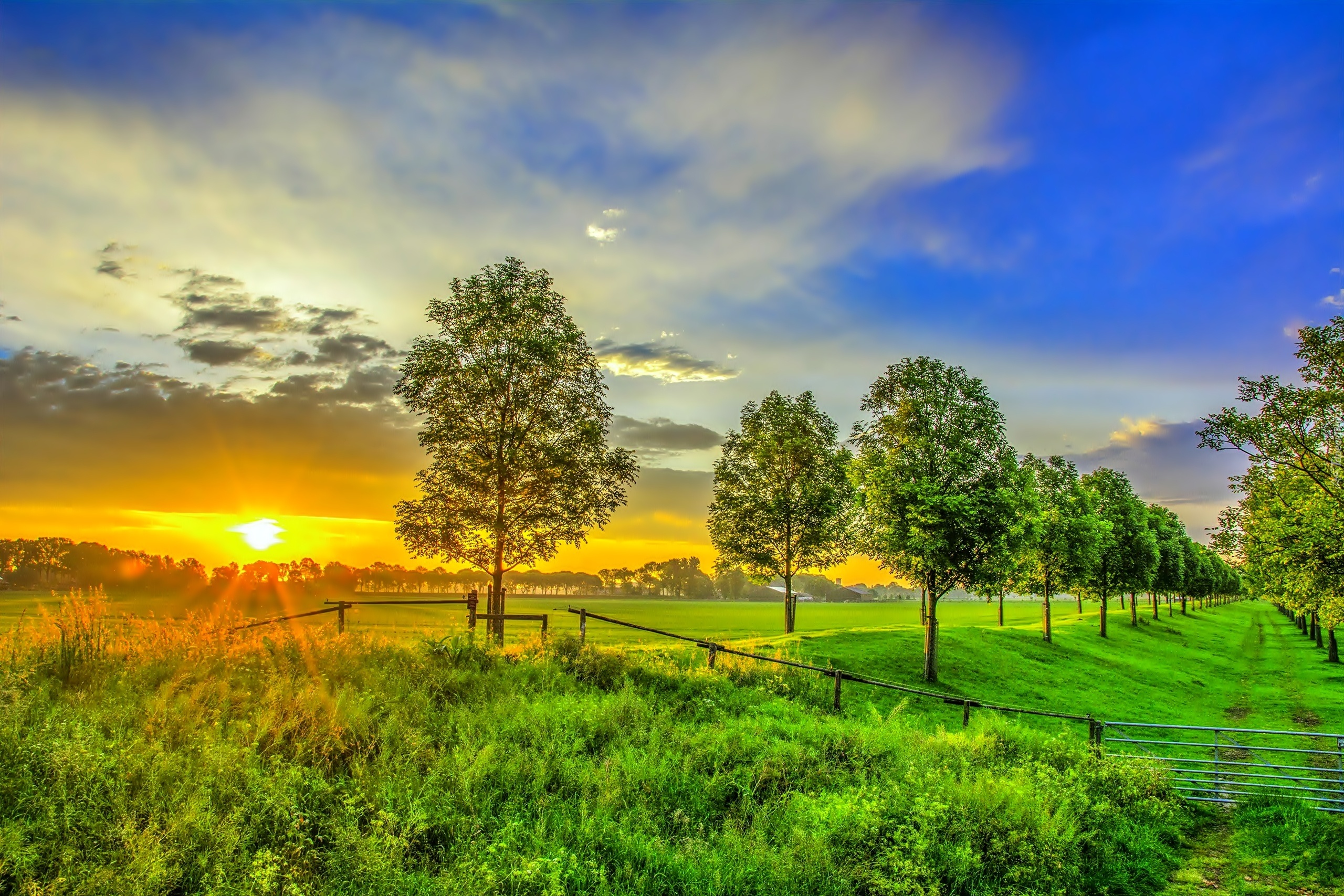 Edytor tapety: Zachód Słońca, Łąka, Drzewa