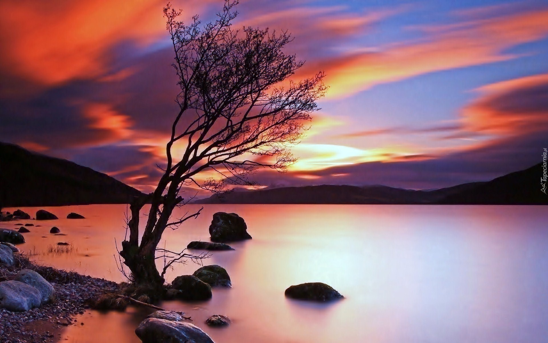 Edytor tapety: Drzewo, Jezioro, Chmury, Zachód słońca