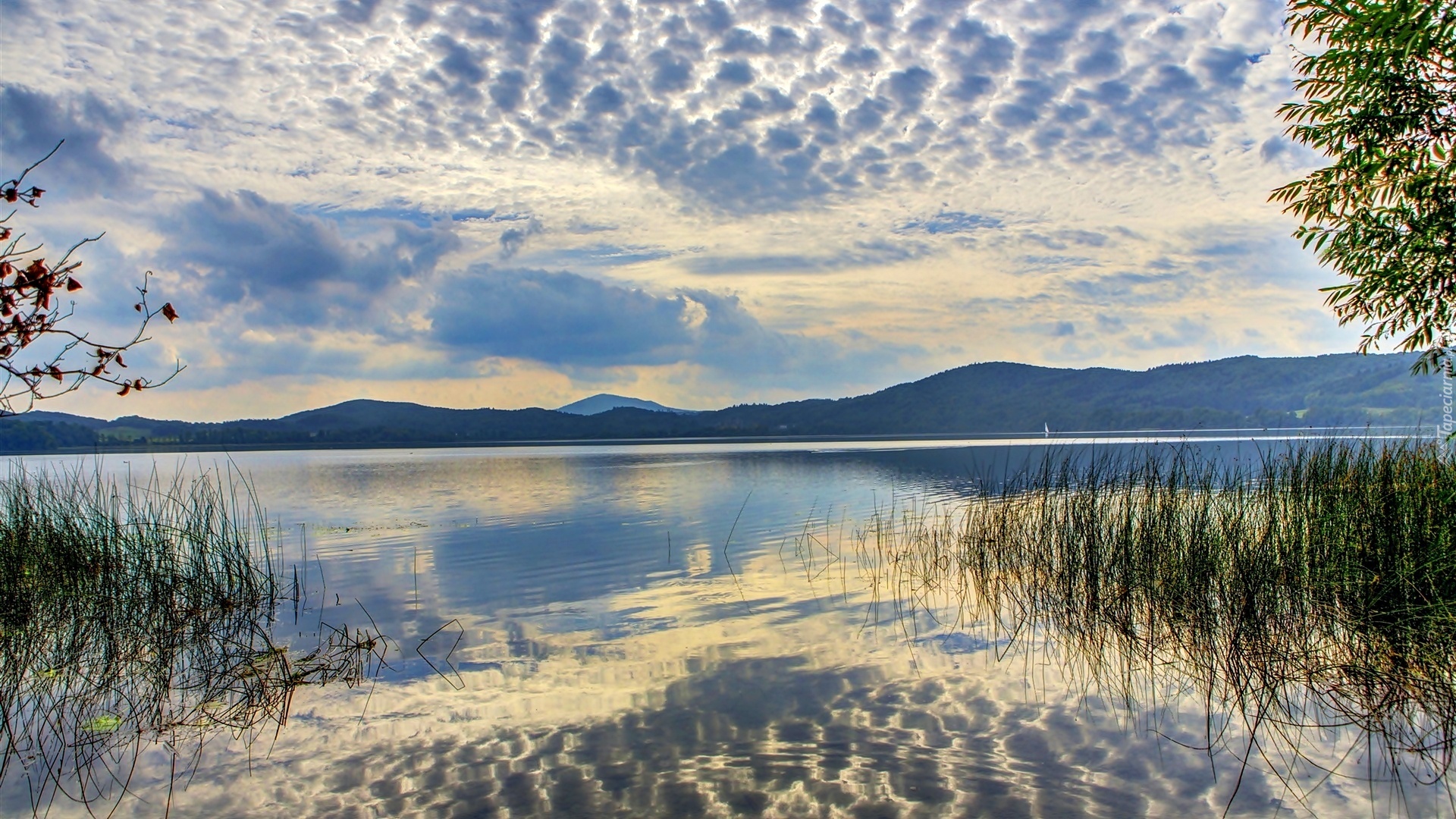 Edytor tapety: Góry, Jezioro, Niebo, Chmury, Trawa