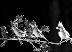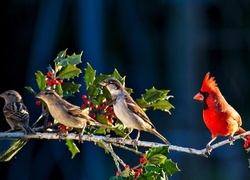 Edytor tapety: Kardynał, Wróble, Gałązka, Ostrokrzew