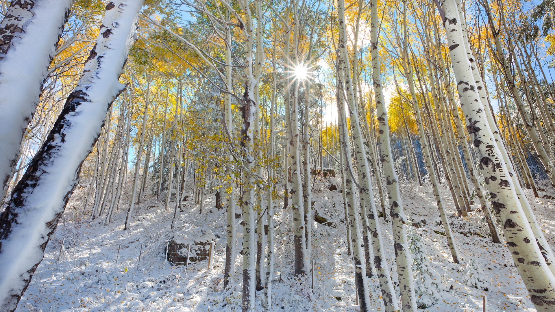 Edytor tapety: Zima, Las, Brzozowy, Promienie słońca