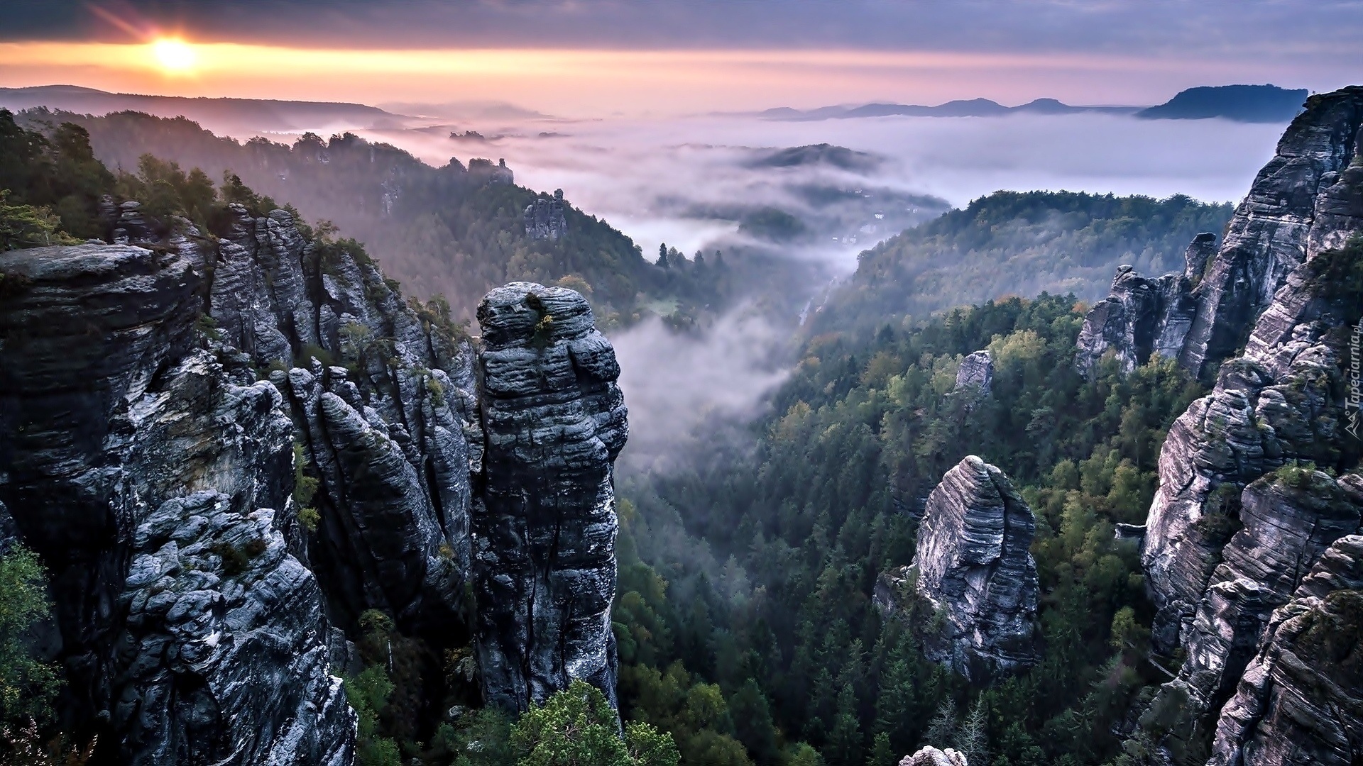 Edytor tapety: Góry, Alpy, Zachód Słońca, Drzewa, Mgła