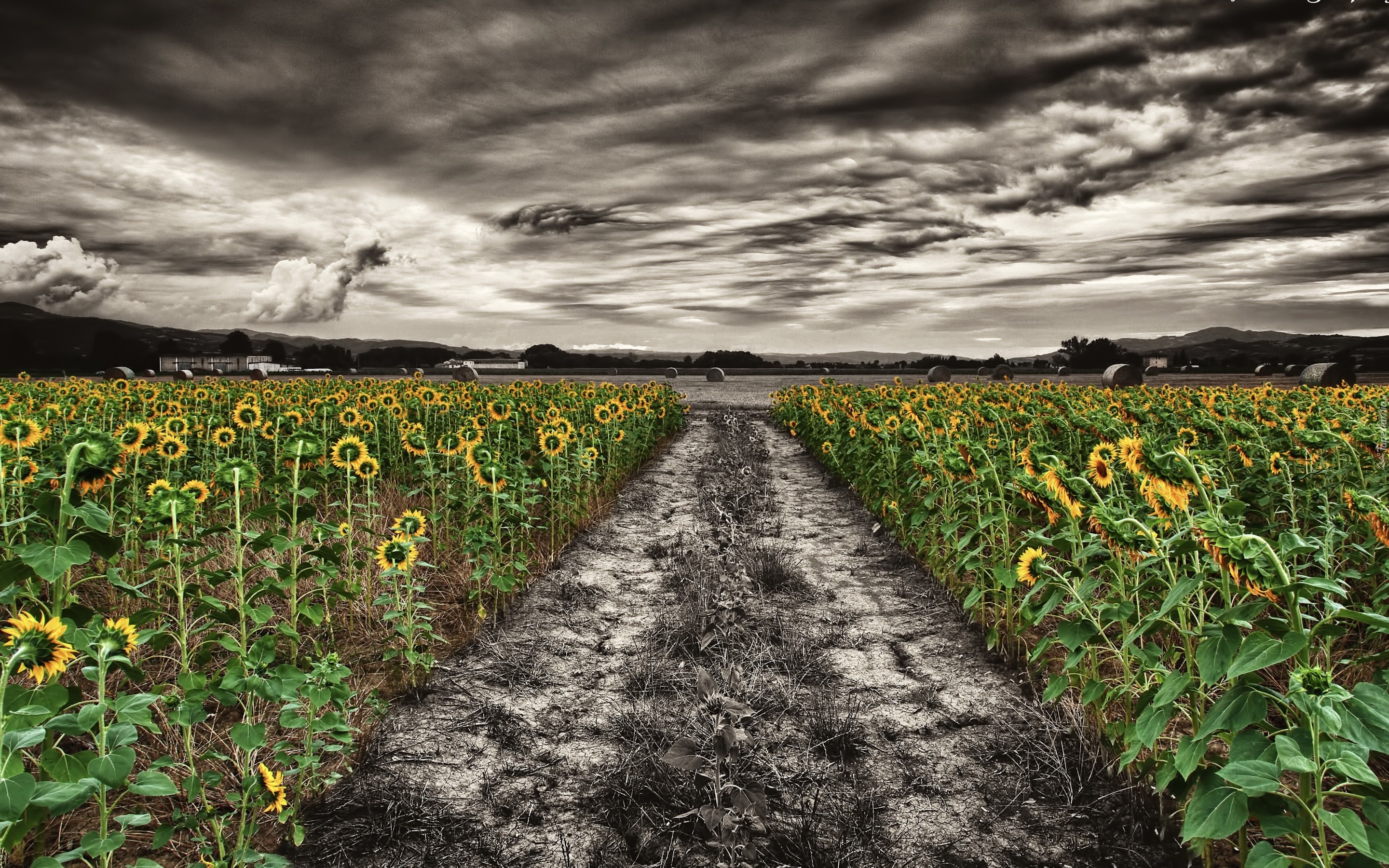 Edytor tapety: Słoneczniki, Pola, Uprawa, Droga