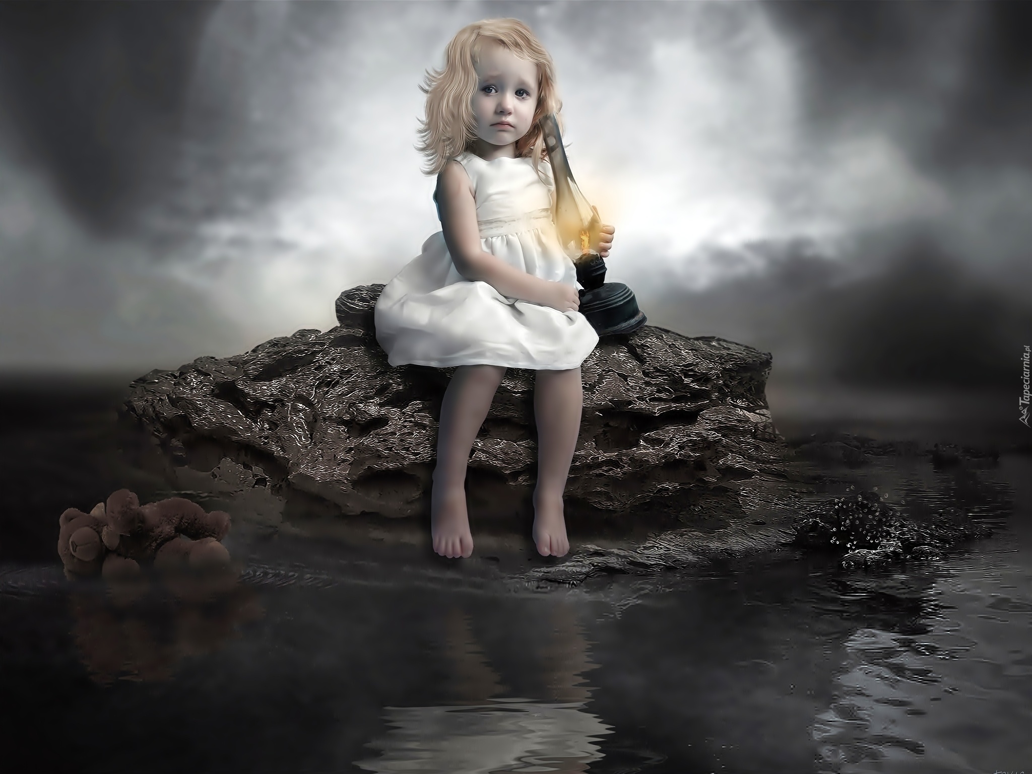Edytor tapety: Dziewczynka, Lampa, Skała, Chmury, Woda