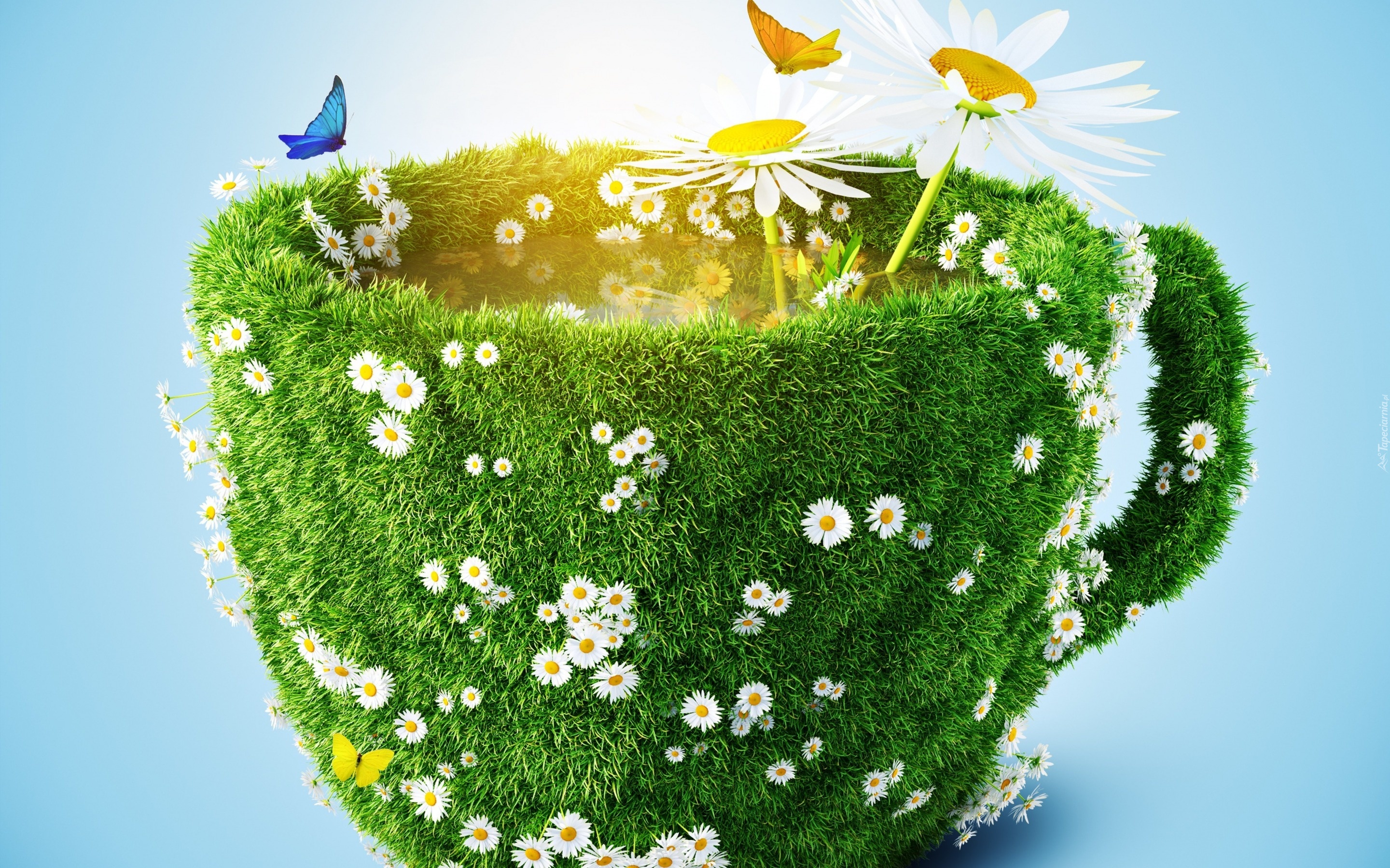 Edytor tapety: Trawa, Kwiaty, Filiżanka