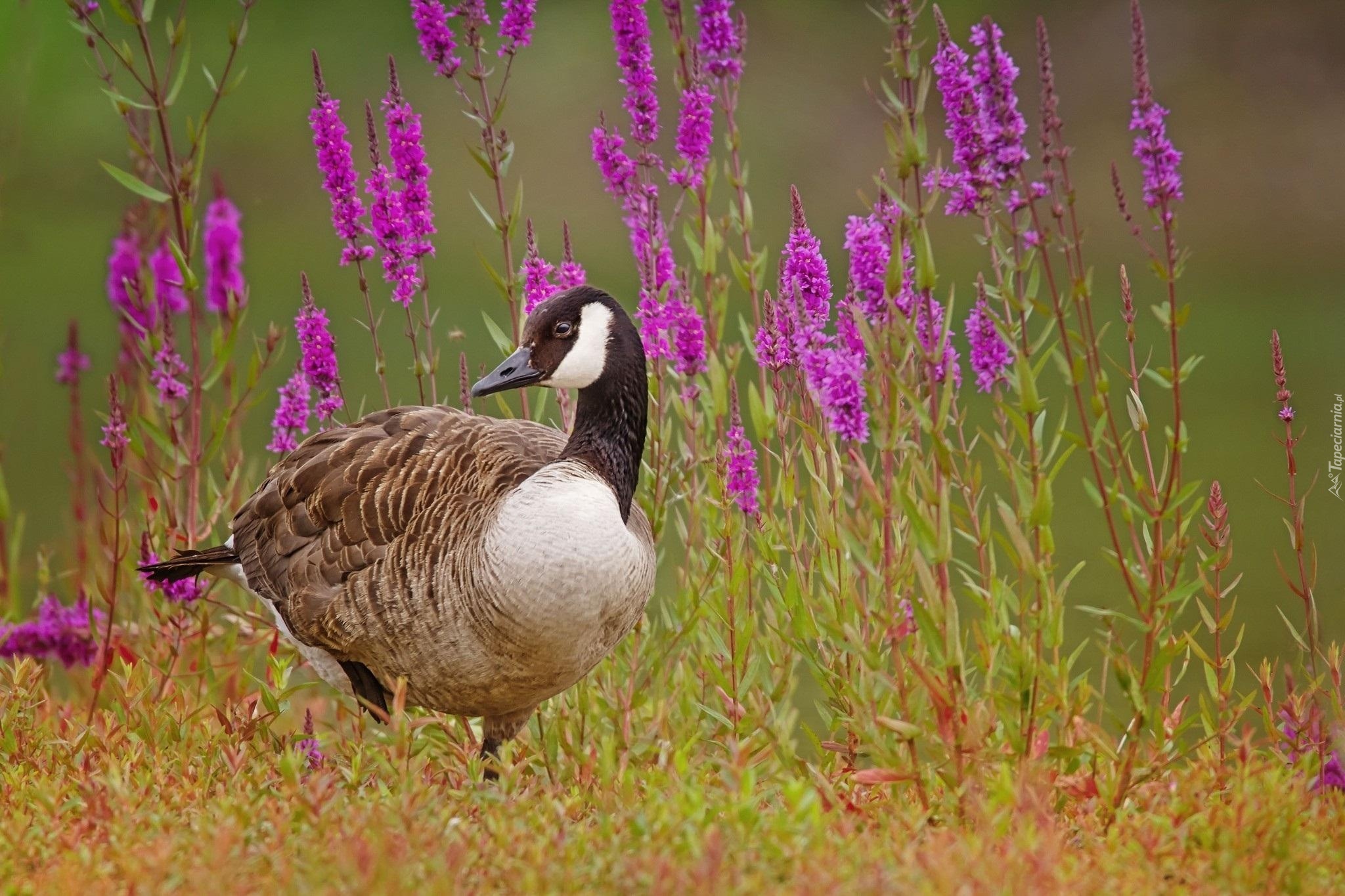 Edytor tapety: Dzika, Gęś, Łąka, Fioletowe, Kwiaty