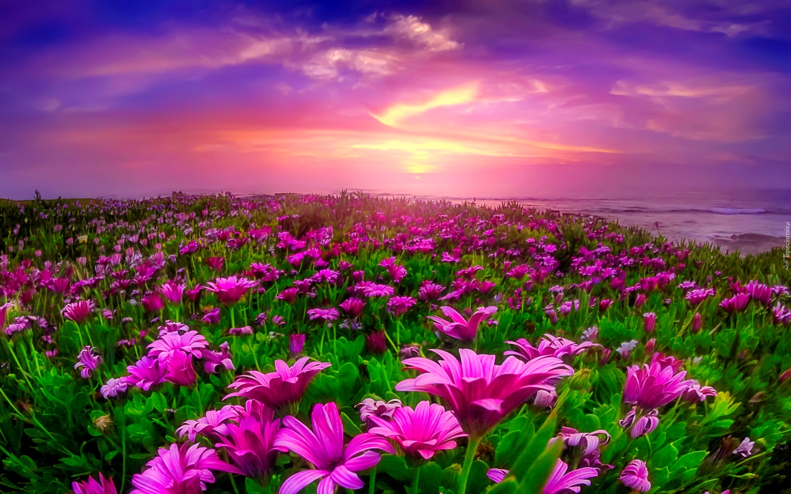 Edytor tapety: Różowe, Kwiaty, Zachód Słońca, Łąka