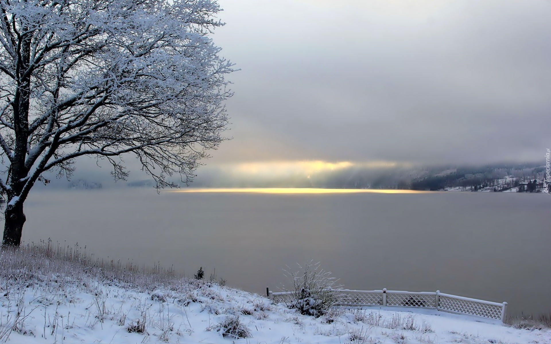 Edytor tapety: Zima, Jezioro, Drzewo, Przebijające, Słońce