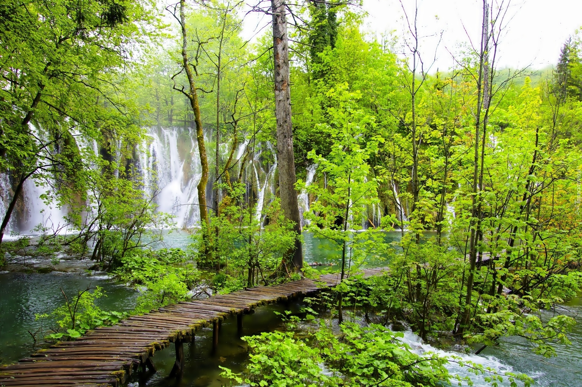 Edytor tapety: Wodospad, Las, Pomost, Plitvice, Chorwacja