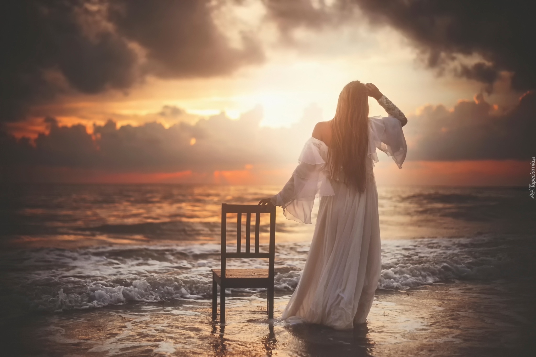 Edytor tapety: Morze, Zachód Słońca, Kobieta, Fale, Chmury, Lato