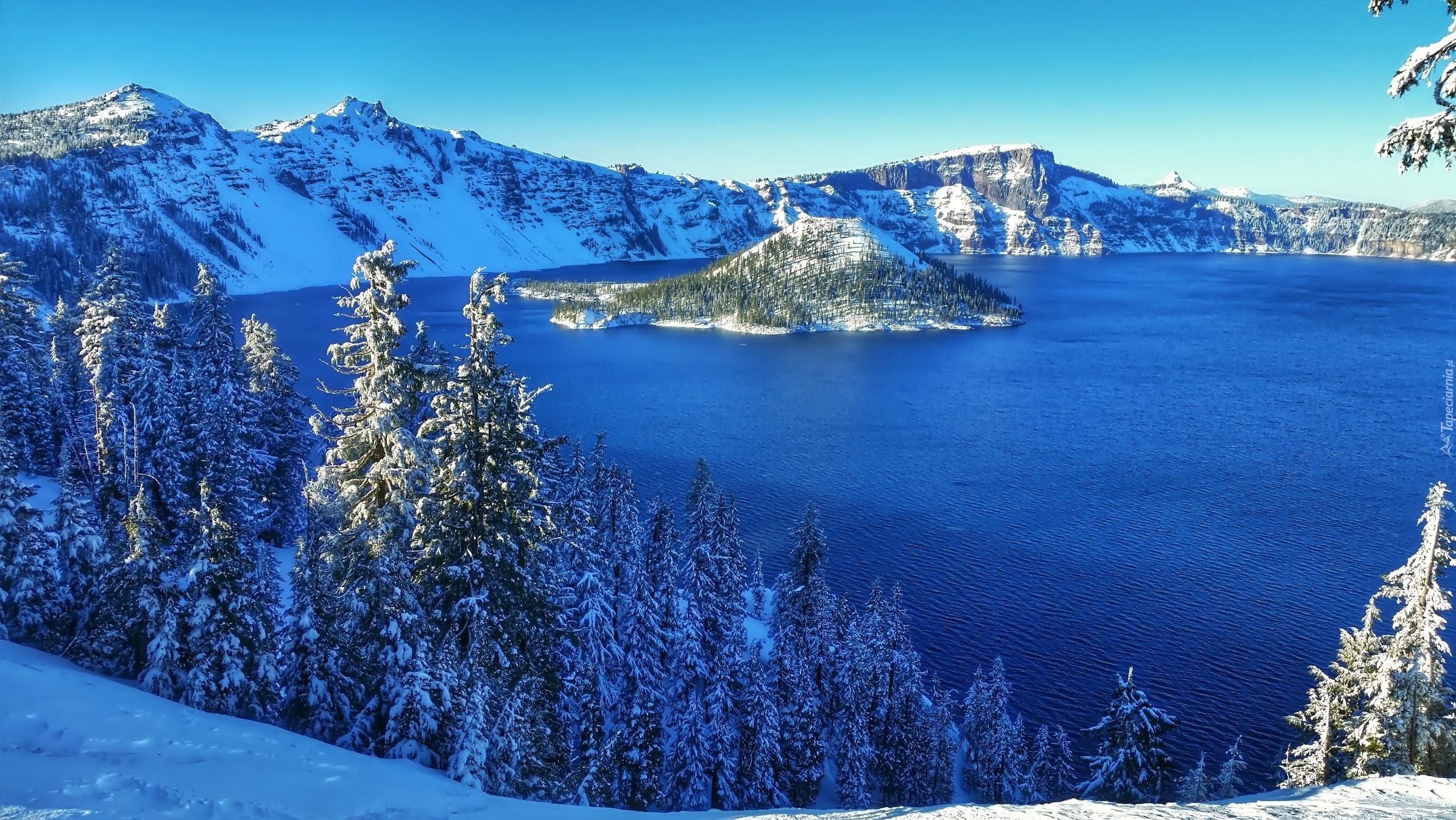 Edytor tapety: Zima, Góry, Jezioro, Wysepka, Las