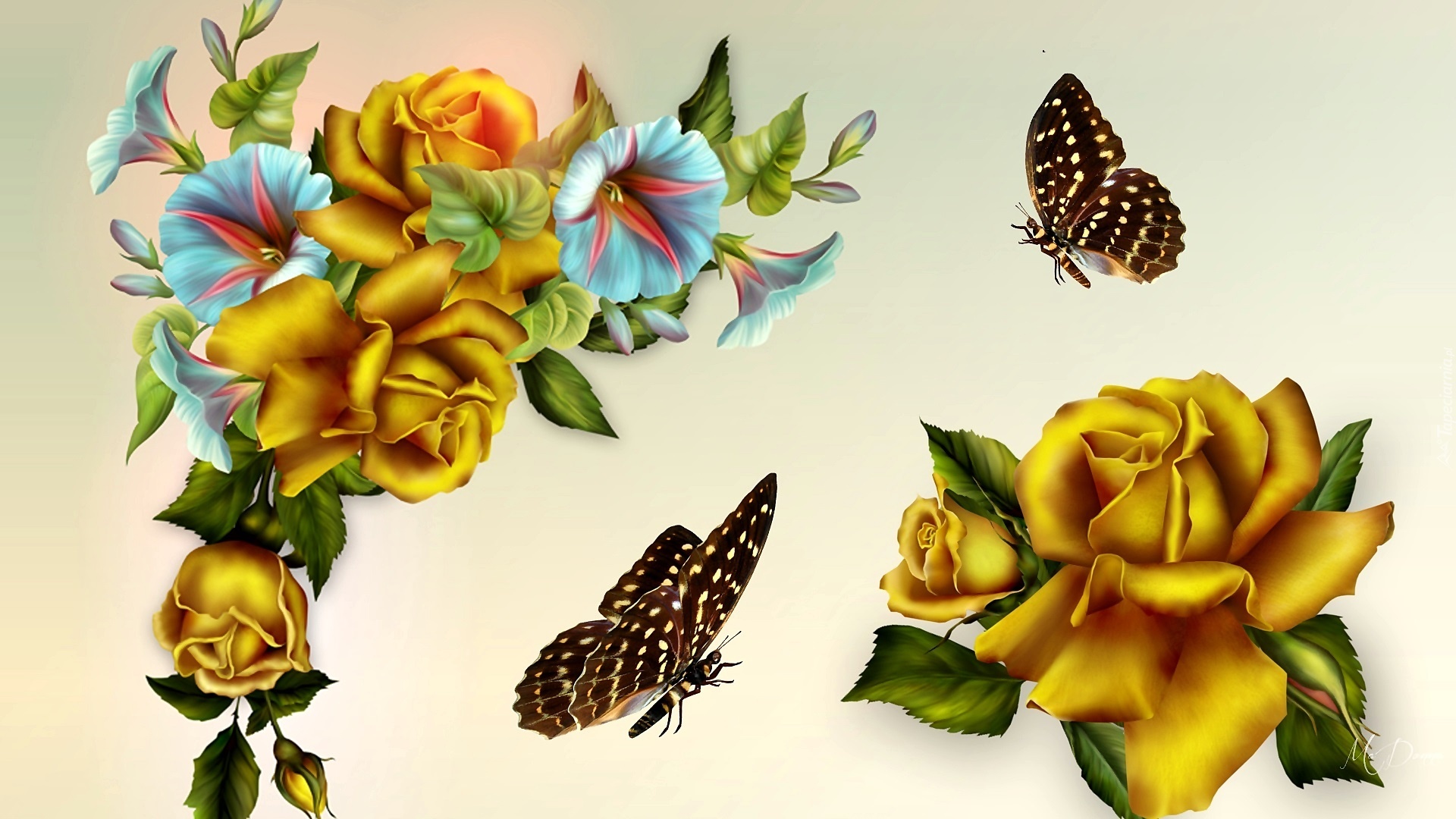 Edytor tapety: Róże, Kwiaty, Motyle, Grafika, Art