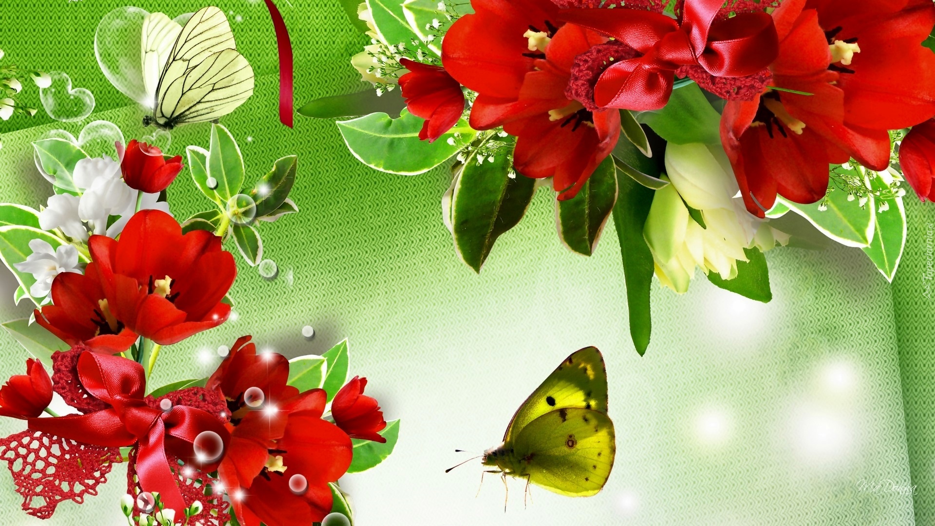 Edytor tapety: Czerwone, Tulipany, Motyle, Grafika, Art
