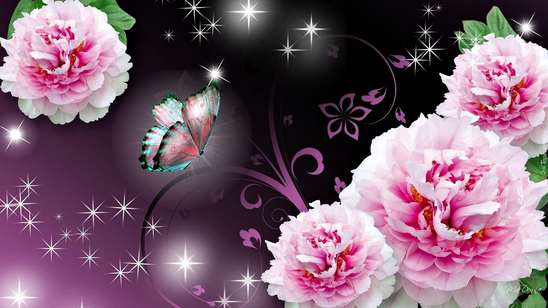 Edytor tapety: Grafika, Gwiazdki, Motyl, Kwiaty, Piwonie