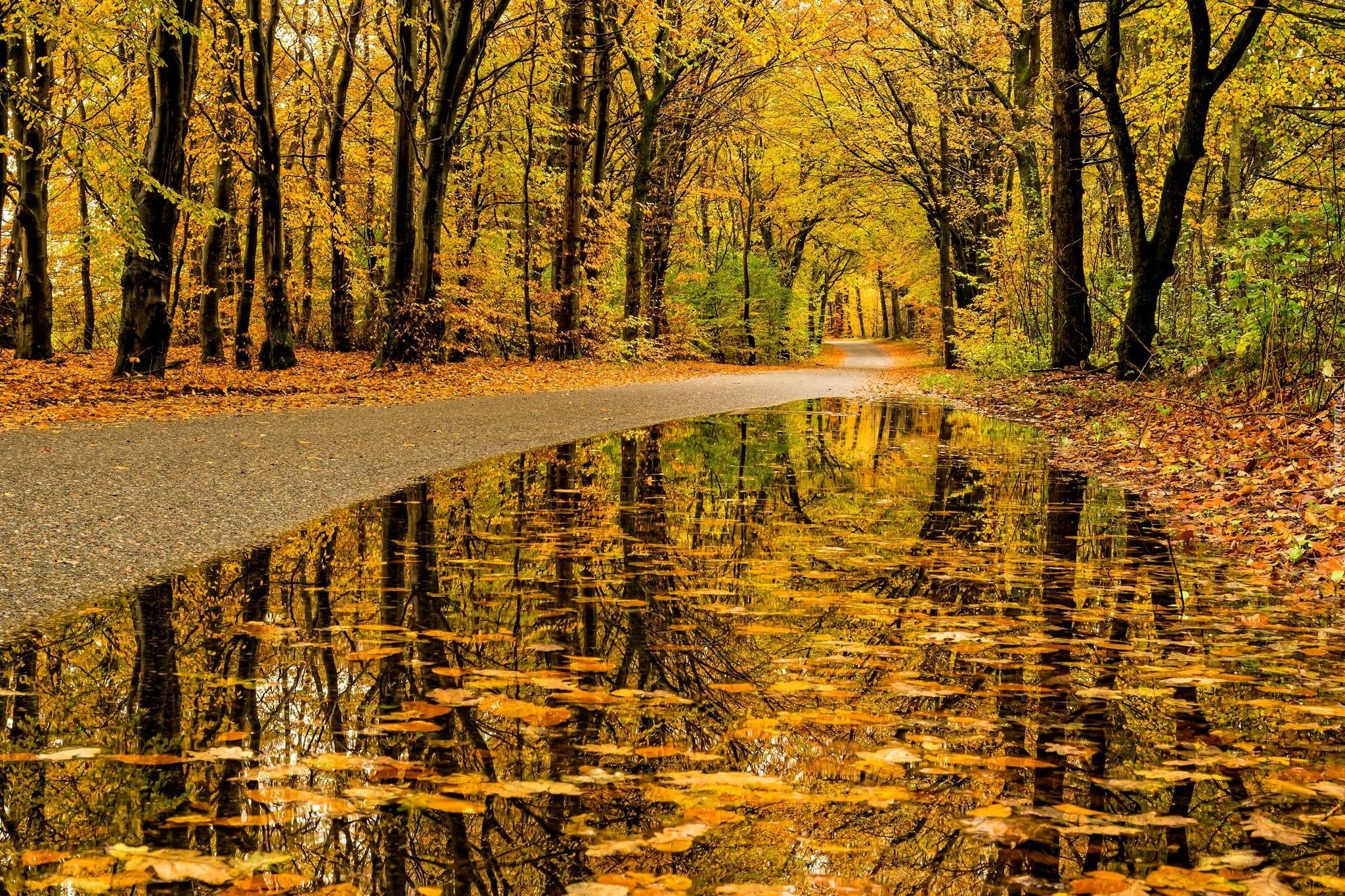 Edytor tapety: Droga, Drzewa, Kałuża, Odbicie, Las