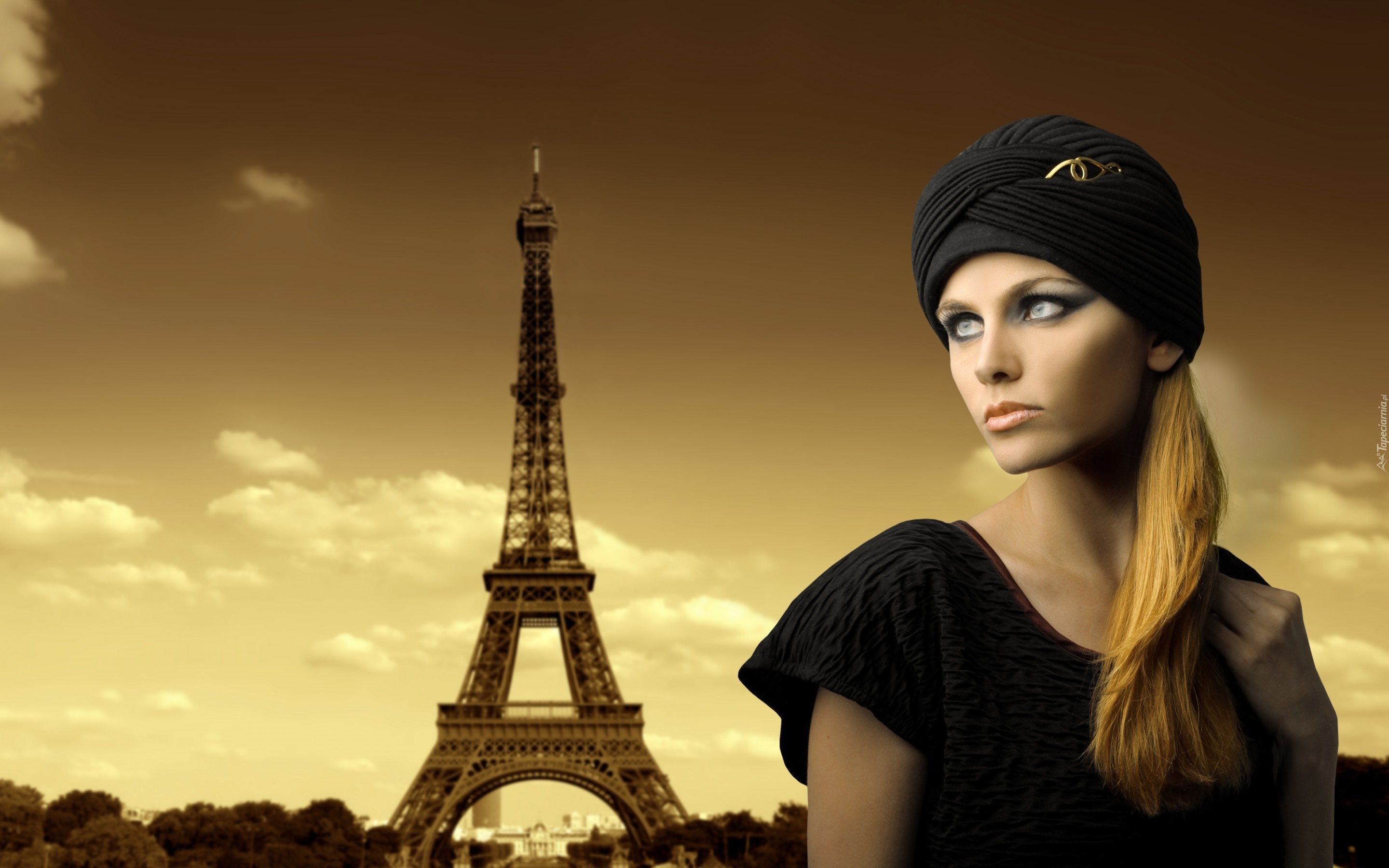 Edytor tapety: Kobieta, Blondynka, Makijaż, Turban, Paryż, Wieża Eiffla