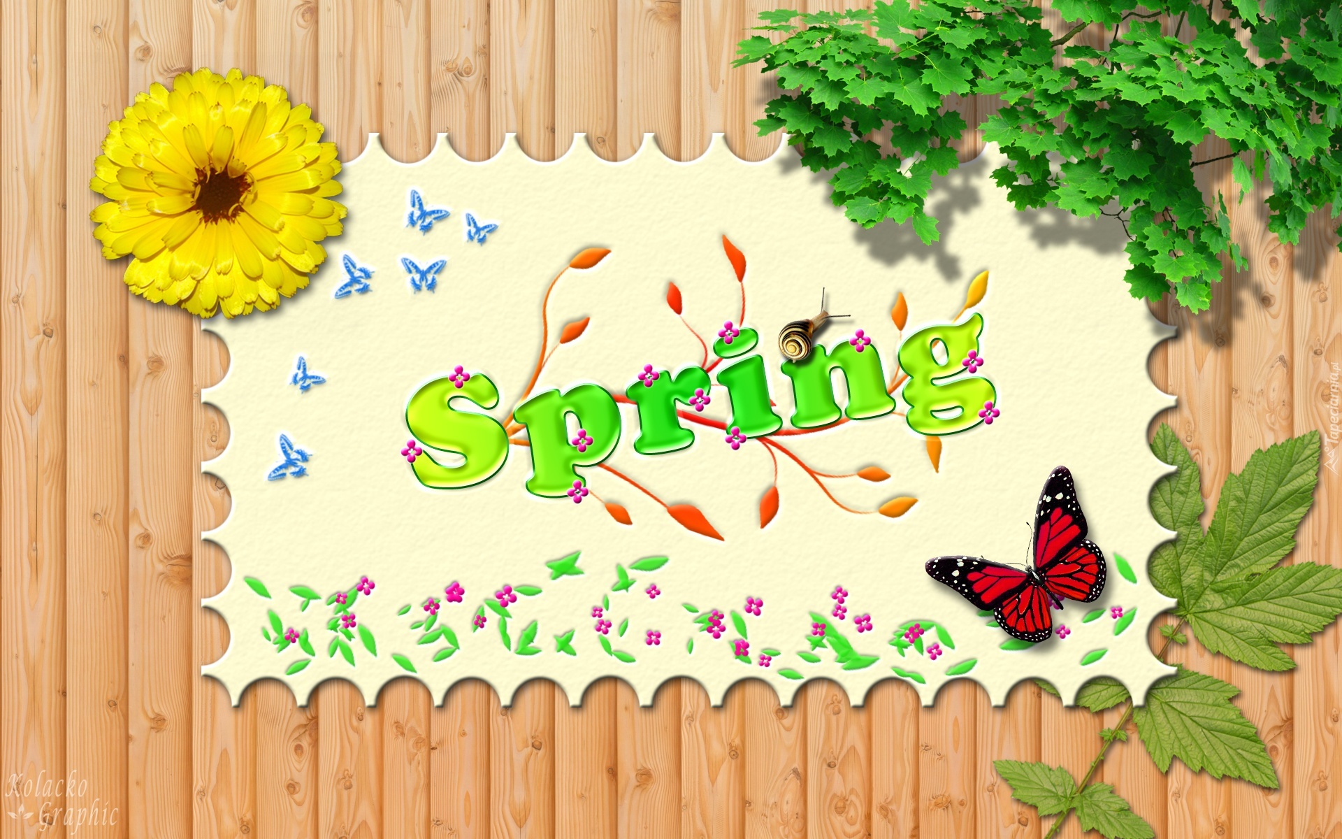 Edytor tapety: Wiosna, Napis, Motylki, Kwiat, Liście