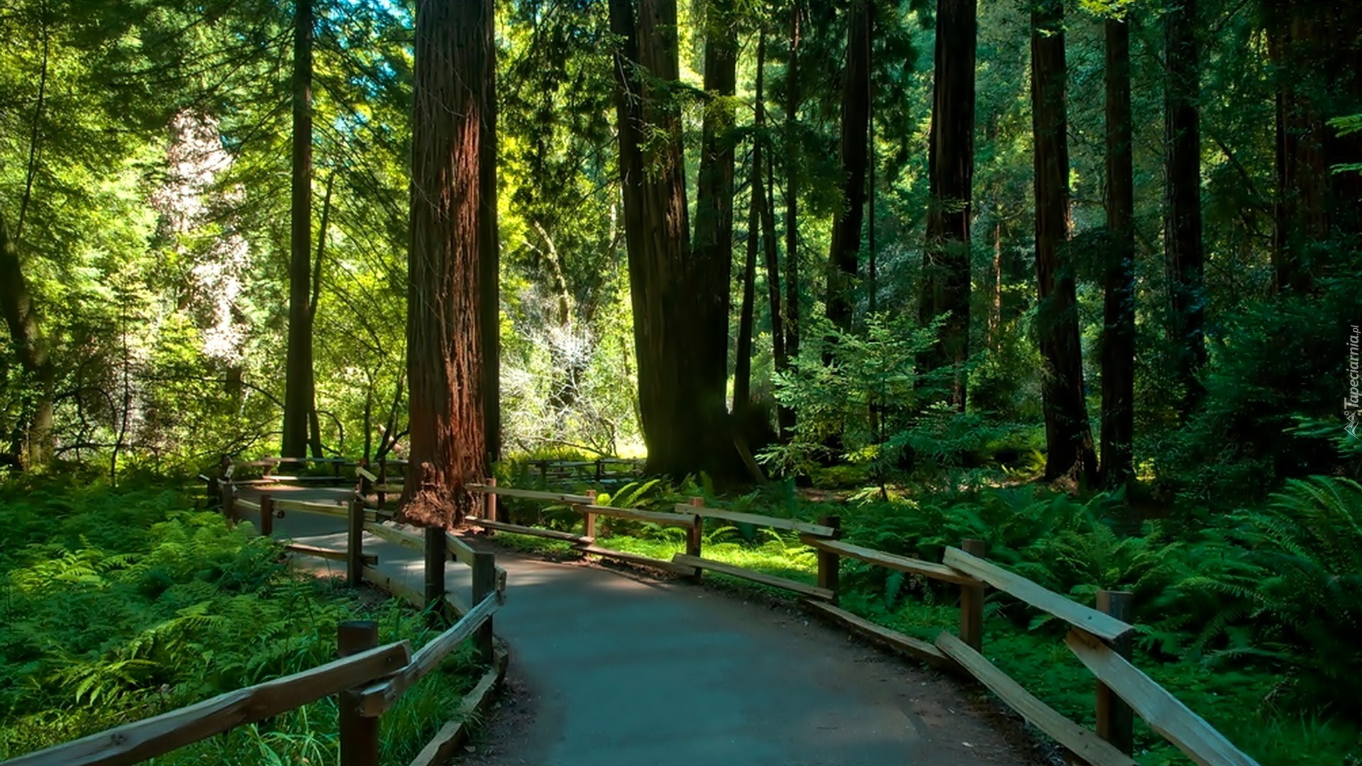 Edytor tapety: Las, Droga, Przebijające, Światło, Drewniane, Barierki
