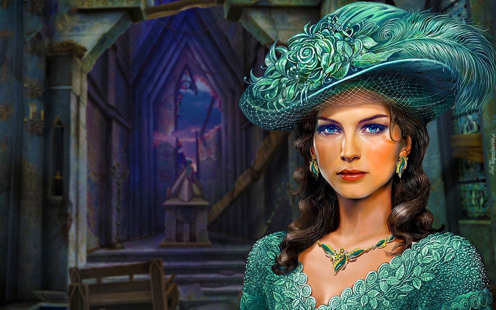 Edytor tapety: Grafika, Kobieta, Zielony Kapelusz, Biżuteria