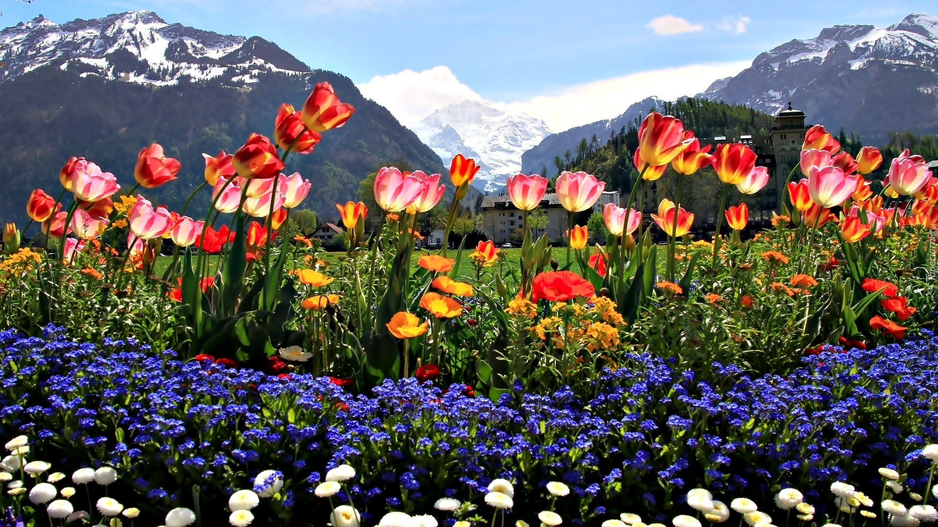 Edytor tapety: Góry, Kwiaty, Tulipany, Stokrotki