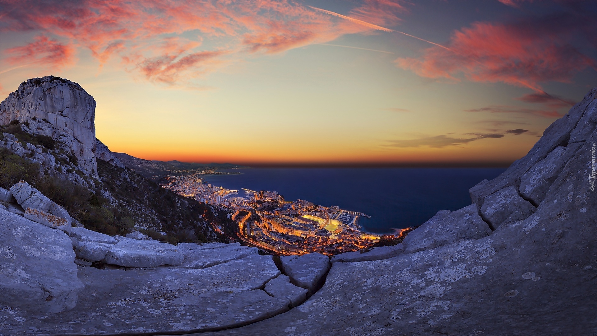 Edytor tapety: Monako, Morze, Miasto, Skały, Zachód, Słońca