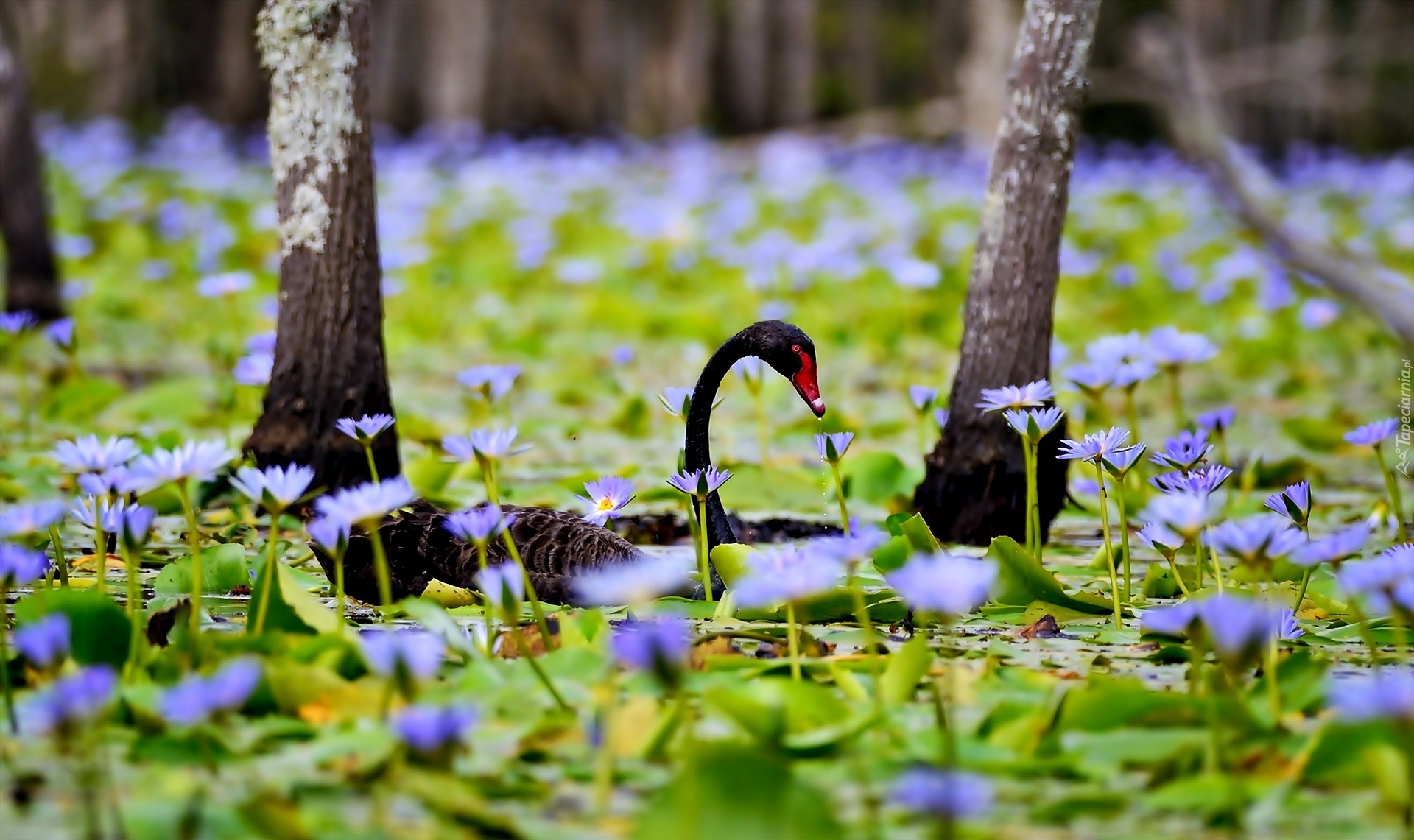 Edytor tapety: Czarny, Łabędź, Staw, Kwiaty, Lilie, Drzewa