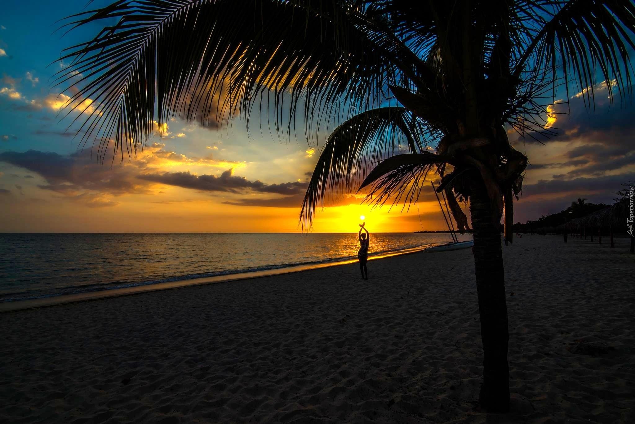 Edytor tapety: Zachód, Słońca, Palma, Morze, Człowiek