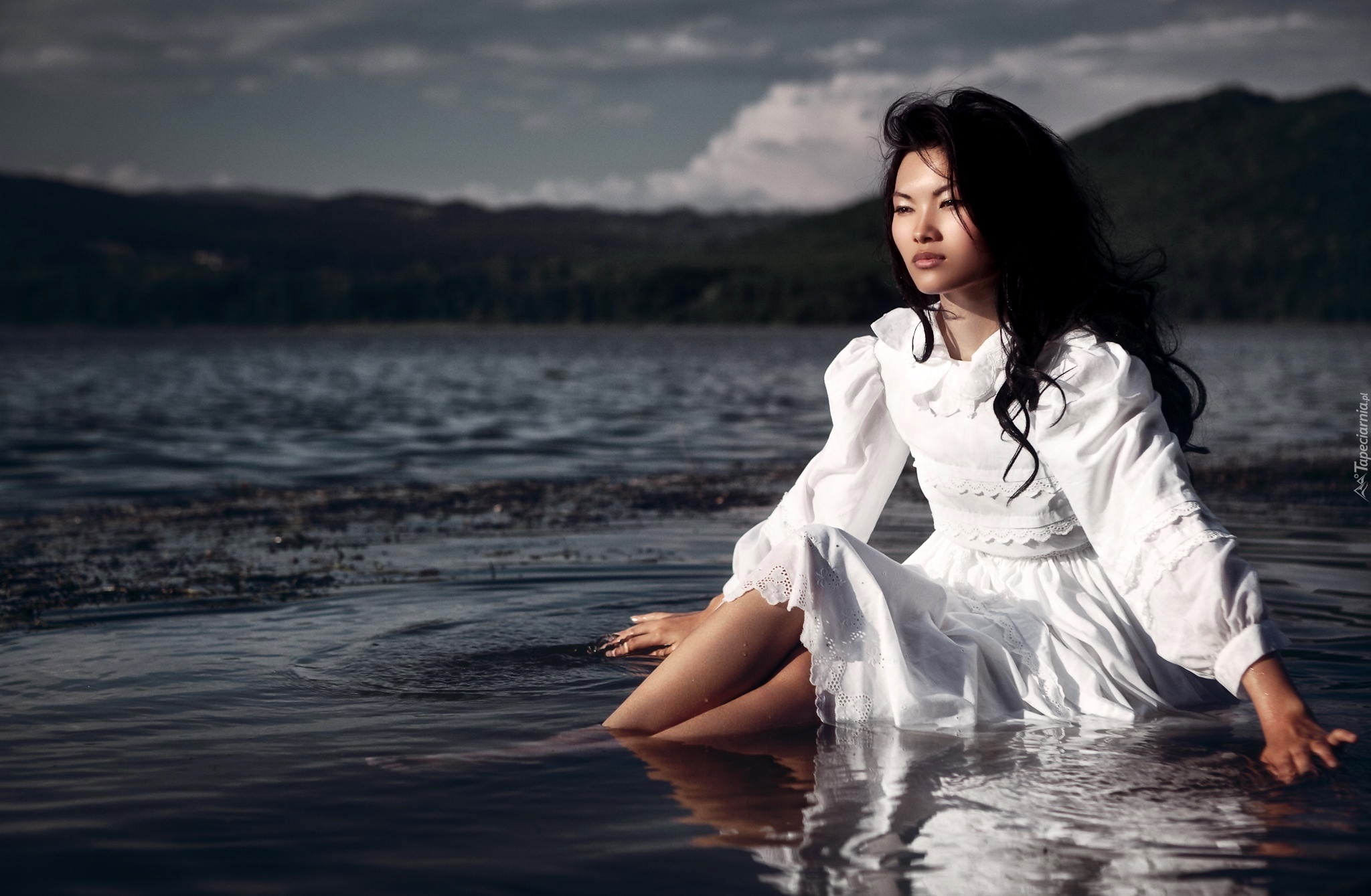 Edytor tapety: Piękna, Kobieta, Azjatka, Biała Sukienka, Woda