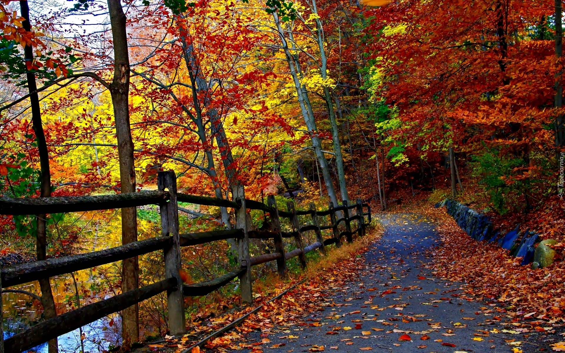 Edytor tapety: Jesień, Las, Drzewa, Droga, Liście, Ogrodzenie, Staw