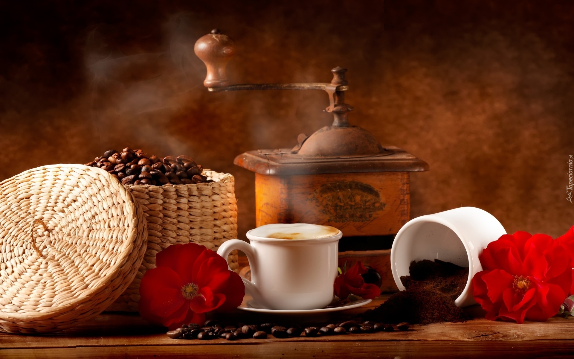 Edytor tapety: Kawa, Ziarenka, Mielona, Młynek, Filiżanka, Kwiaty