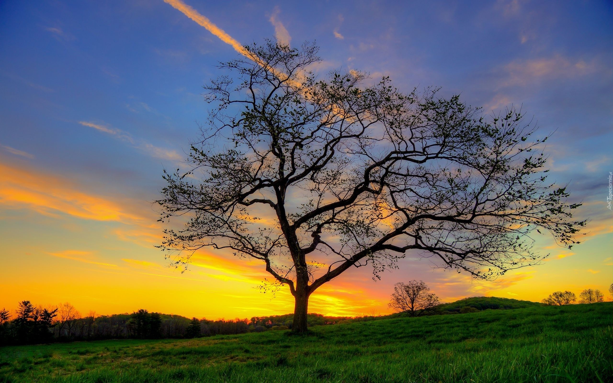 Edytor tapety: Drzewo, Zachód Słońca, Łąka