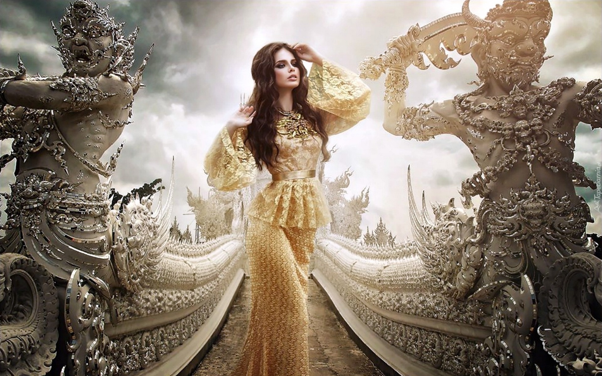 Edytor tapety: Kobieta, Brunetka, Makijaż, Biżuteria, Schody, Posągi