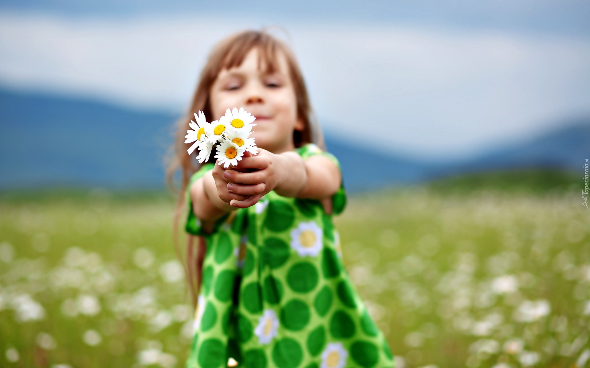 Edytor tapety: Dziewczynka, Zielona, Sukienka, Bukiet, Kwiatów