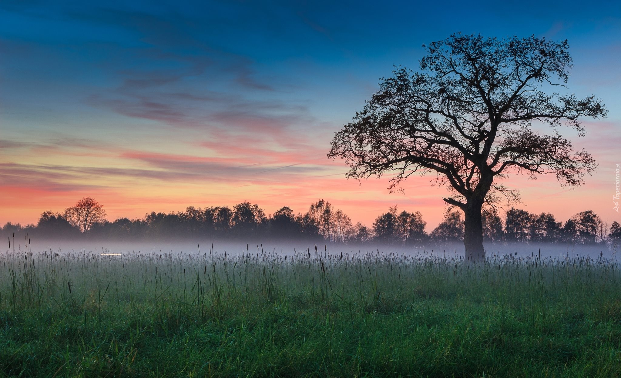 Edytor tapety: Drzewo, Łąka, Mgła, Niebo
