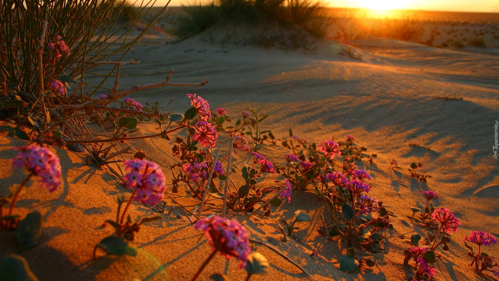 Edytor tapety: Pustynia, Zachód Słońca, Kwiaty