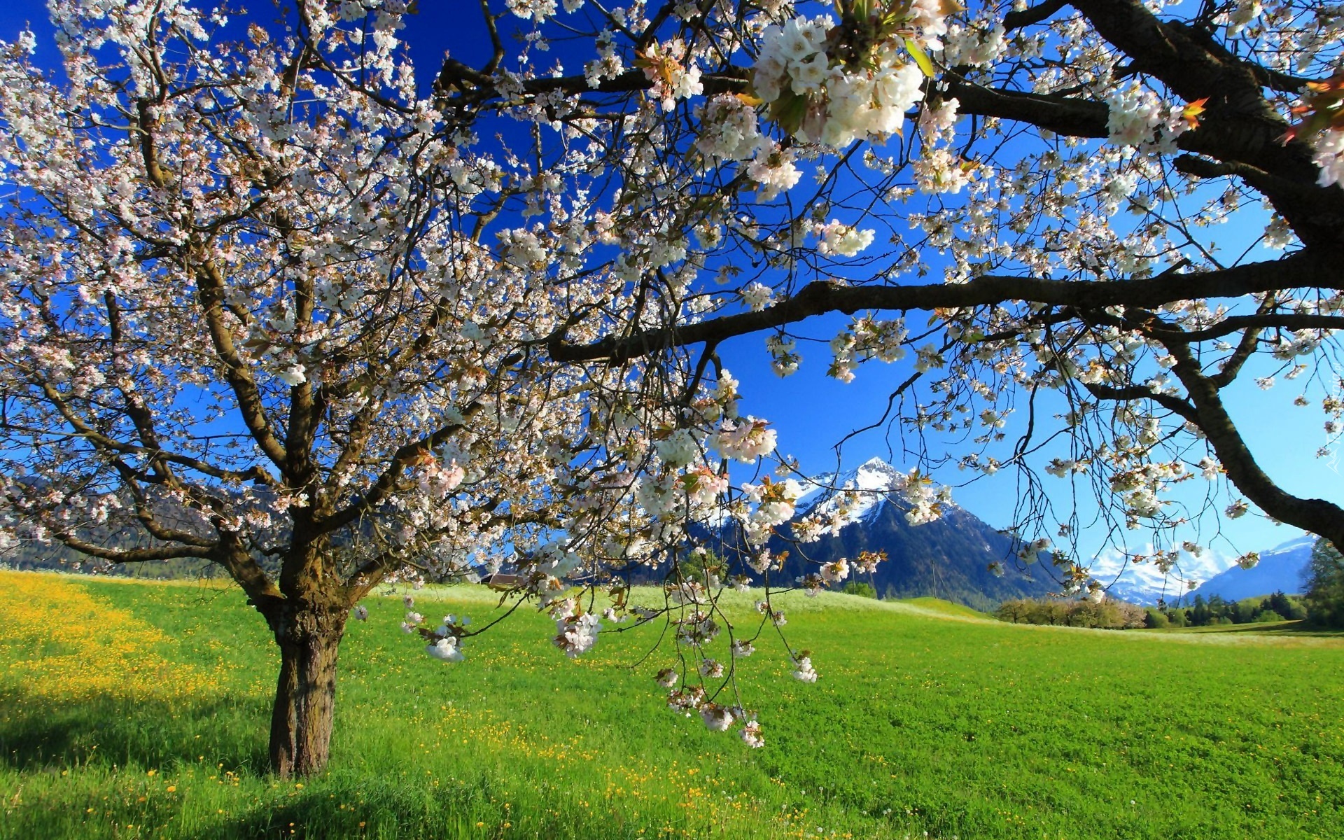Edytor tapety: Wiosna, Kwitnące, Owocowe, Drzewa, Góry, Łąka