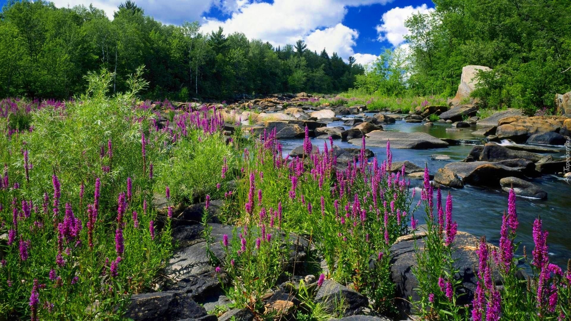 Edytor tapety: Potok, Kamienie, Las, Polne Kwiaty