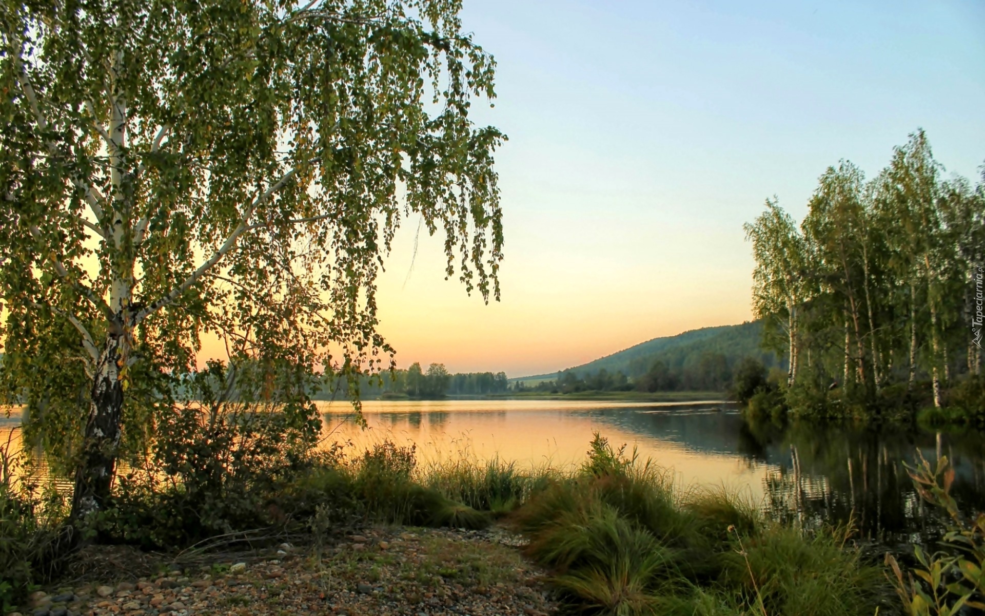 Edytor tapety: Jezioro, Wschód, Słońca, Trawa, Brzozy
